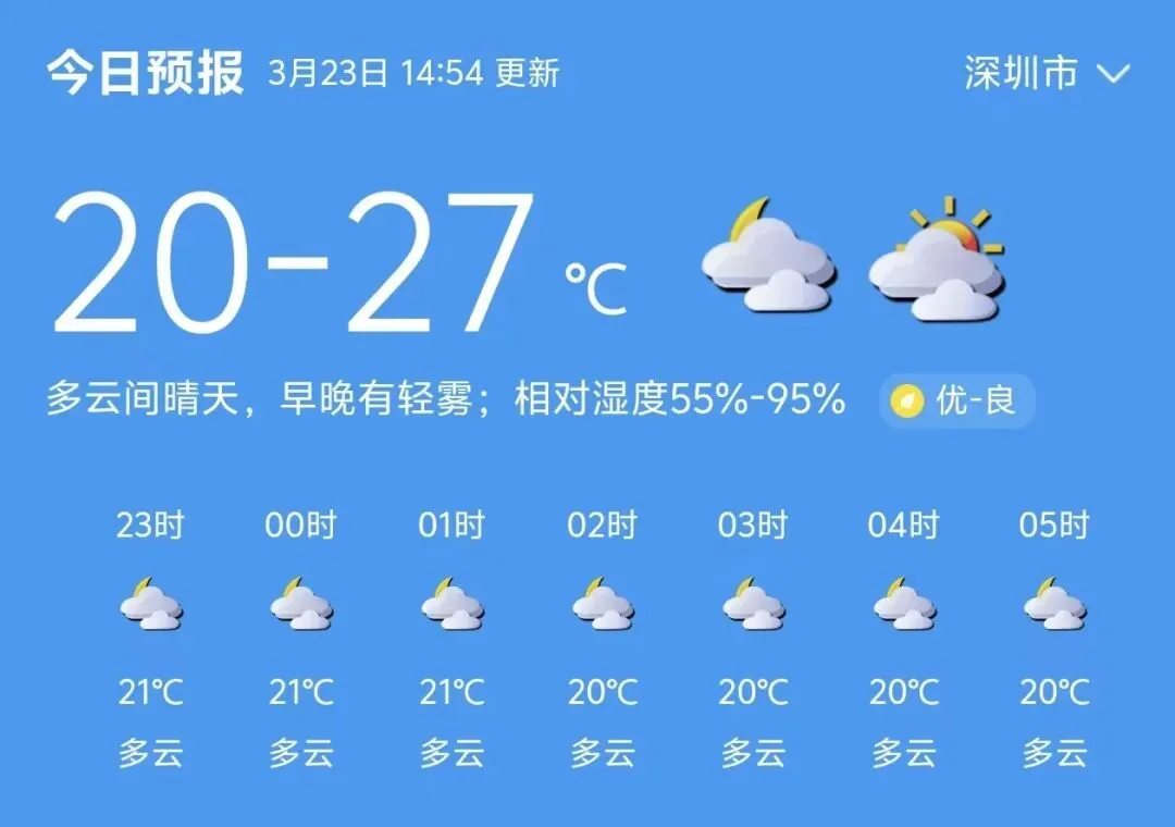 预计24日,多云间晴天,早晚有轻雾,气温20℃-27℃。