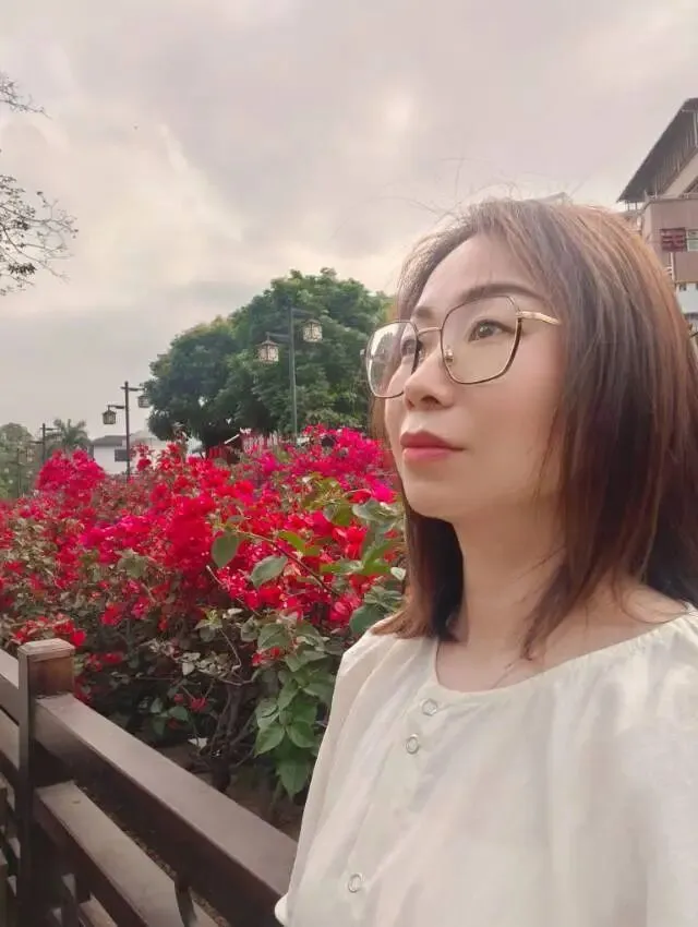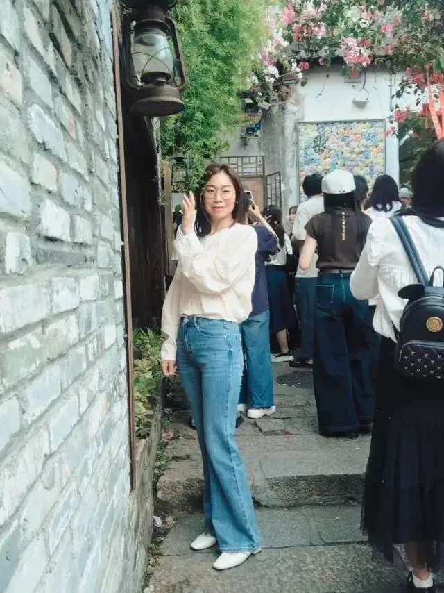 站在开满玫红三角梅的花墙前,木质栏杆衬得人温柔又松弛。