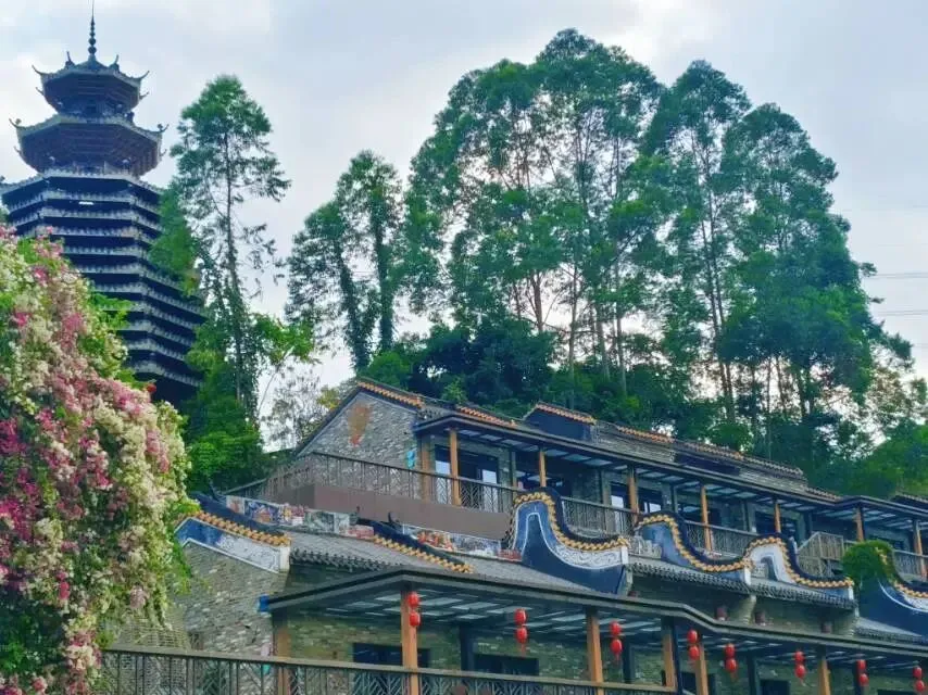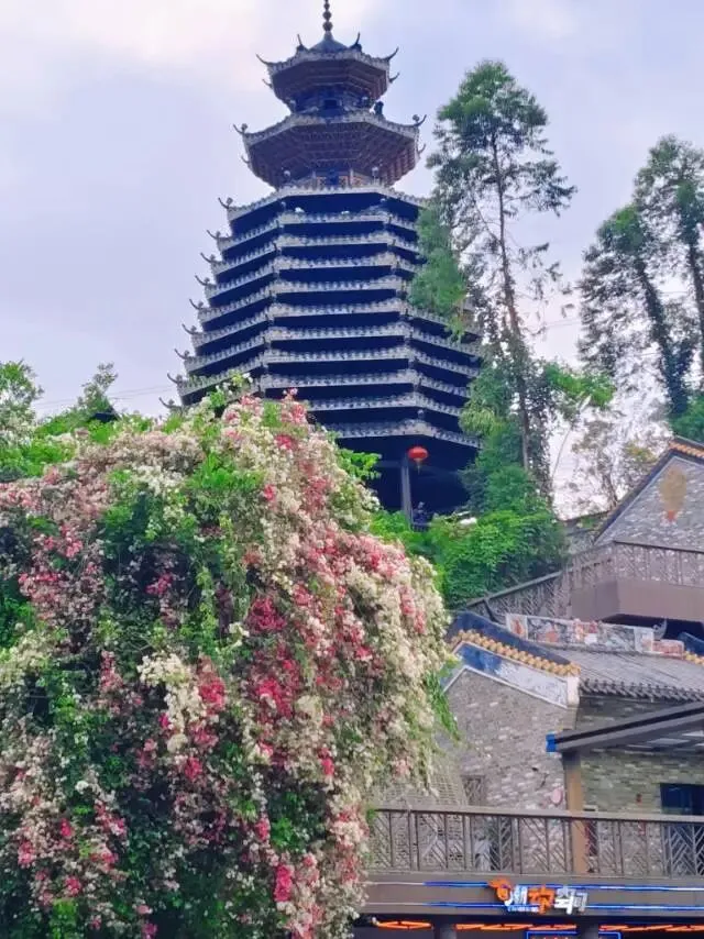 换个角度看塔楼,三角梅瀑布从枝头倾泻而下,几乎要将塔身温柔包裹。
