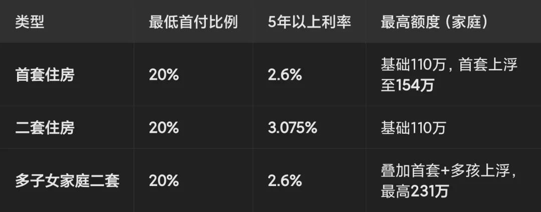 额度计算:可贷额度 = 公积金账户余额 × 16倍。多子女家庭(二孩及以上)购买二套住房,适用首套利率且额度最高上浮110%。
