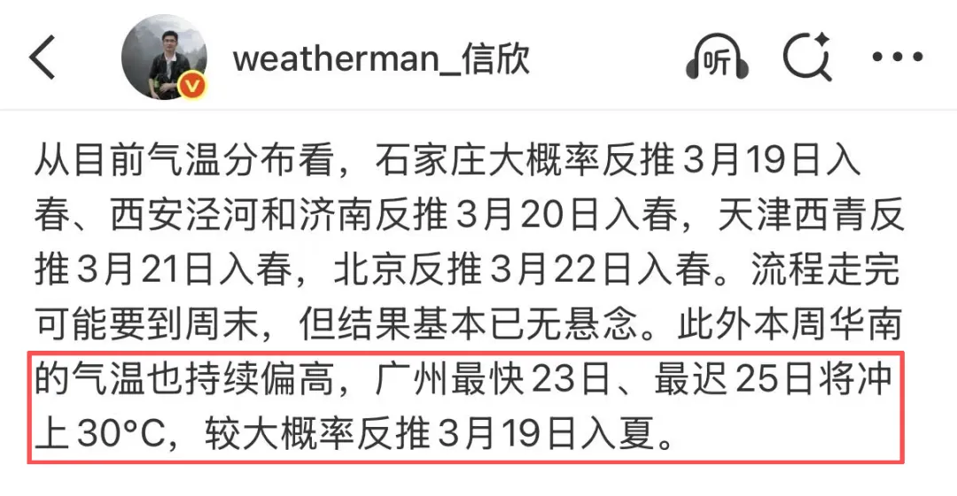 另据中国气象频道气象分析师信欣预计,广州最快23日、最迟25日将冲上30℃,较大概率反推3月19日入夏。