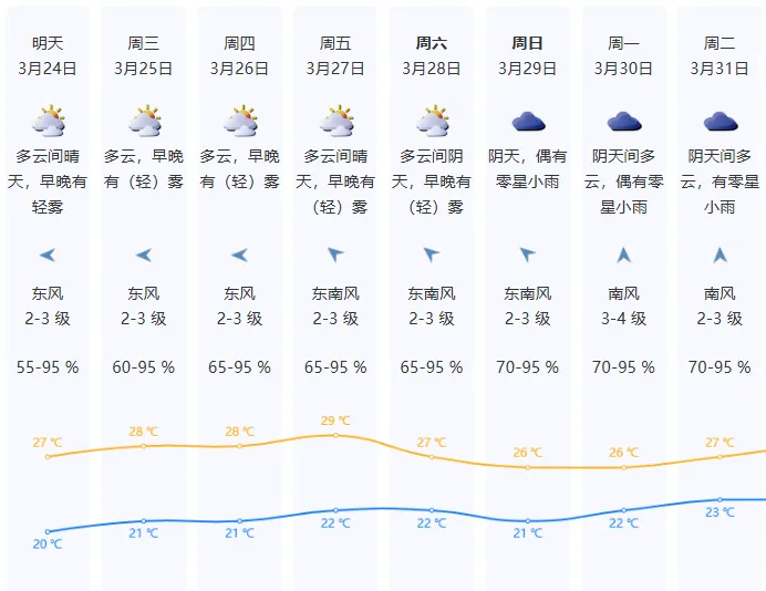 3月25日至28日,多云为主,早晚有轻雾或雾,白天可见阳光,午间较热。