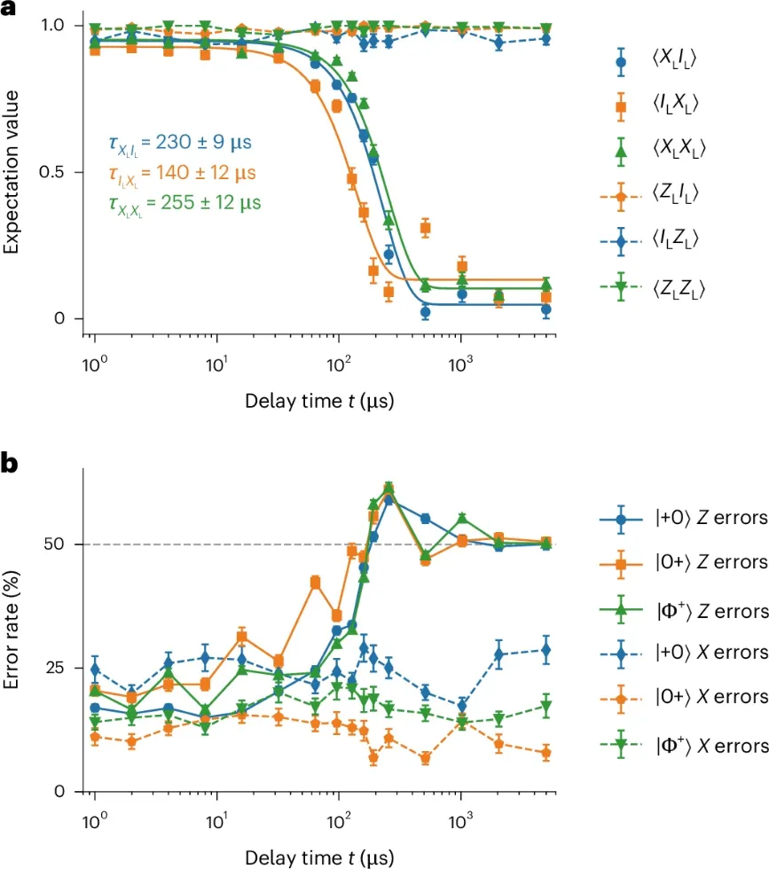 图2. 逻辑相干时间与错误率。a.逻辑相干时间和寿命进行了表征:在|Φ⁺>L态上测量期望值⟨XLIL⟩和⟨ILZL⟩,在|0+>L态上测量⟨ILXL⟩和⟨ZLIL⟩,在|Φ⁺>L态上测量⟨XLXL⟩和⟨ZLZL⟩。b. 错误率是通过对稳定器奇偶校验的后处理得到的。由稳定器ŜZ检测到的量子比特翻转错误(X)保持其初始值。相比之下,由稳定器ŜX检测到的相位翻转错误(Z)会随物理量子比特退相干的延迟时间t增加而上升。每个数据点均为1000次实验重复的平均值。误差棒代表通过自助重采样法估算的均值的1个标准差。