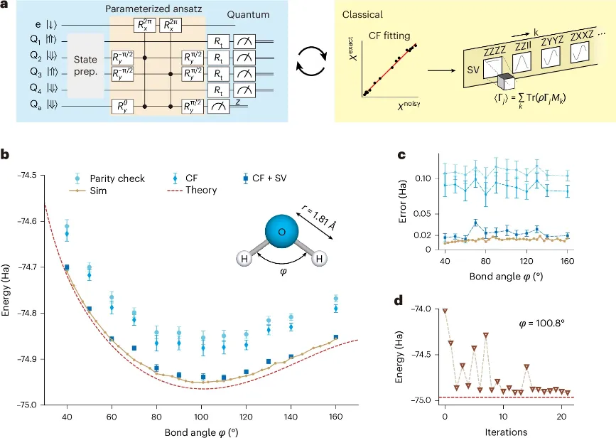 图5. 通过变分量子本征求解器(VQE)计算水分子基态能量。a. VQE工作流程示意图,包含量子与经典阶段。量子电路制备逻辑态|10>L、应用酉耦合簇拟设,并执行部分层析测量;经典阶段通过Clifford拟合和对称性验证进行错误缓解,经典优化器迭代更新参数θ直至能量收敛。b. H2O分子势能面与键角φ的关系。红色为精确对角化结果,棕色为电路级噪声模拟结果,蓝色点为经错误缓解的实验结果。c. 模拟与理论之间的能量偏差(棕色),以及实验与理论之间的偏差(蓝点),每点基于至少500次实验重复,误差棒表示均值的1倍标准差。d. 在φ = 100.8°时的迭代过程,VQE在30次迭代内达到能量偏差ΔE ≤ 0.02 Ha,参数偏差Δθ ≤ 0.01 rad。