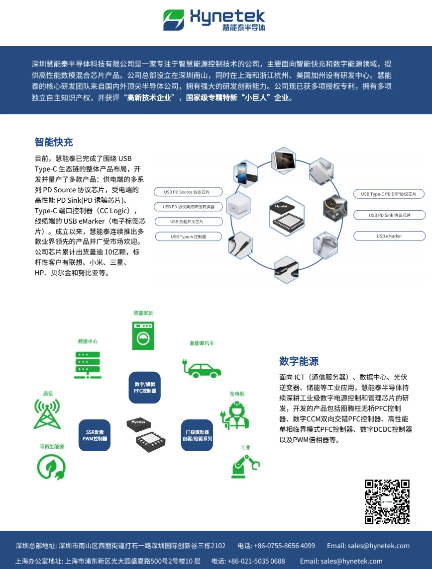 深圳慧能泰半导体科技有限公司是一家专注于智慧能源控制技术的公司,主要面向智能快充和数字能源领域,提供高性能数模混合芯片产品。公司总部设立在深圳前海,同时在上海和浙江杭州设有研发中心。慧能泰的核心研发团队来自国内外顶尖半导体公司,拥有强大的研发创新能力。公司现已获多项授权专利,拥有独立自主知识产权,并于2020年被评为“高新技术企业”,2023年被评为国家级专精特新“小巨人”企业。