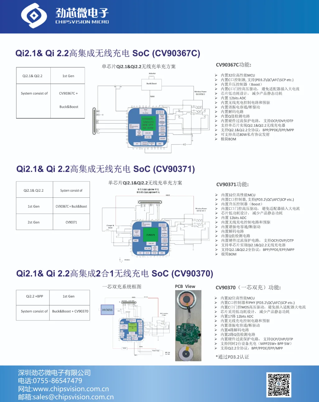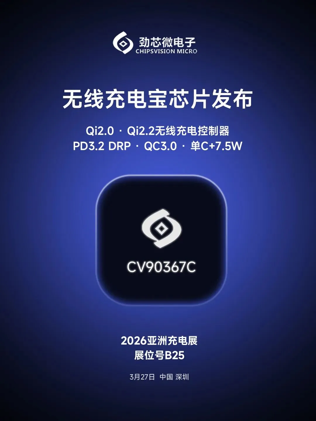 除CV90370外,劲芯微电子还将展示 CV90367C无线充电宝芯片,产品支持 Qi2.0 - Qi2.2 无线充电控制,并兼容 PD3.2 DRP、QC3.0 等功能,适用于无线充电与有线快充融合应用。