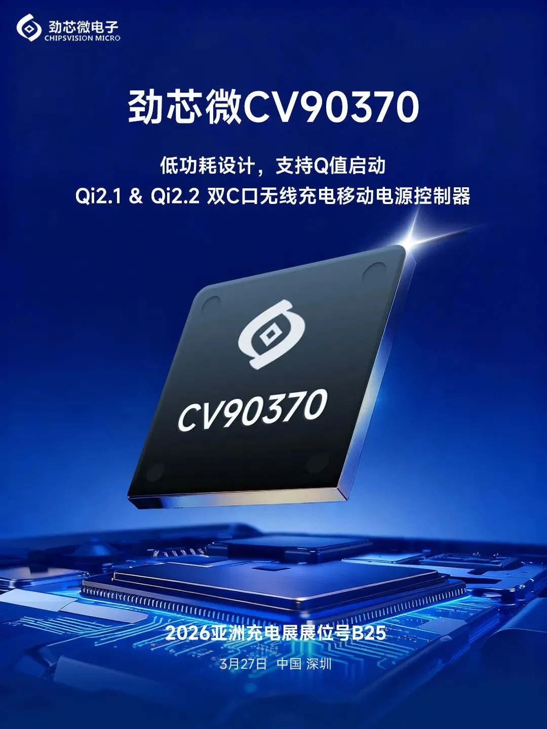 劲芯微电子将在本届亚洲充电展展示 CV90370,这是一款主打低功耗设计、支持Q值启动的 Qi2.1 & Qi2.2 双C口无线充电移动电源控制器,面向新一代磁吸无线充电宝等应用。