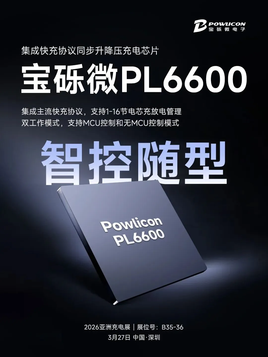宝砾微电子将在现场展示 PL6600,这是一款 集成快充协议的同步升降压充电芯片,支持 1-16 节电芯充放电管理,并兼容 MCU 控制 与 无 MCU 控制 两种模式。
