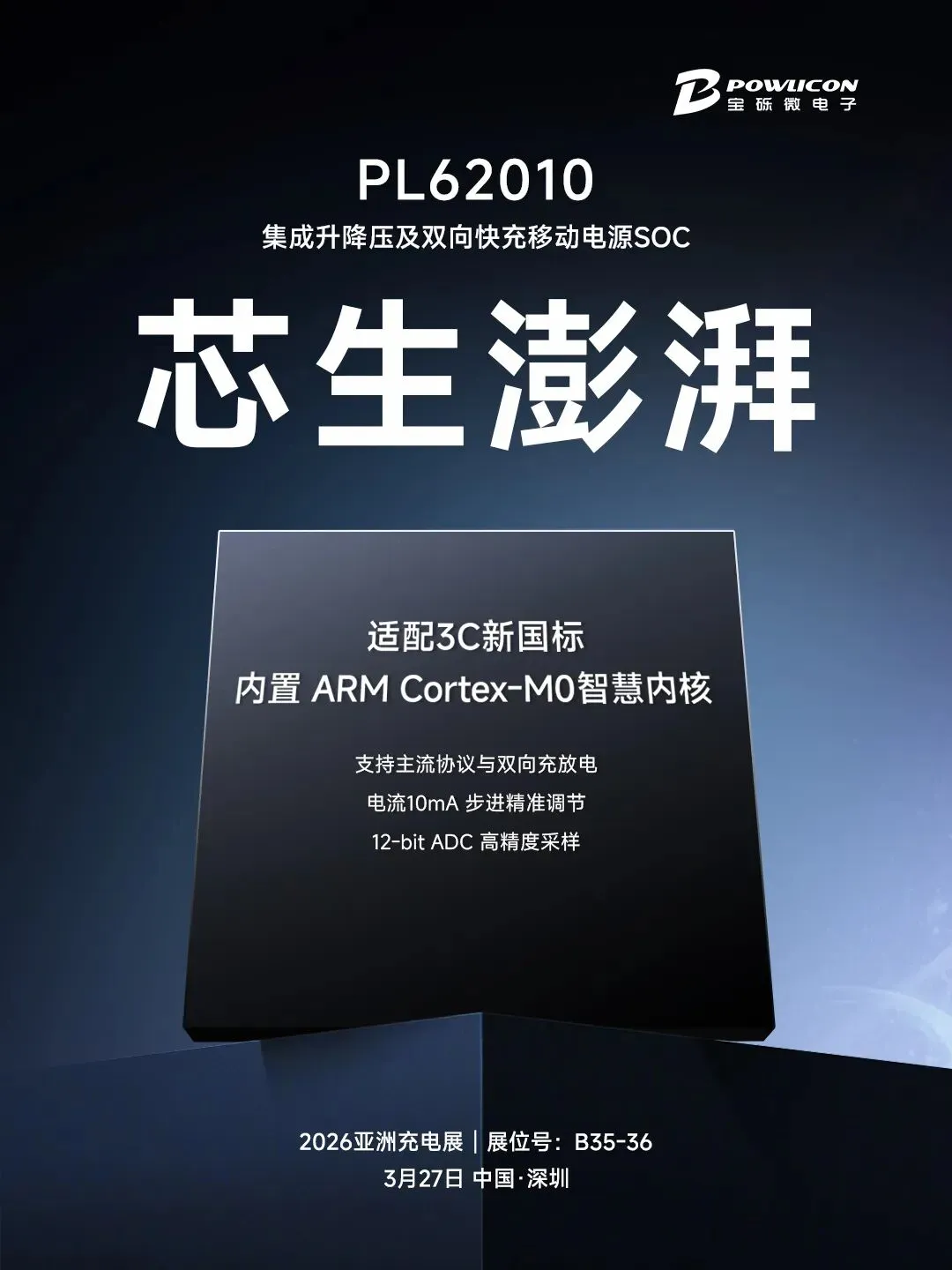 宝砾微还将带来 PL62010,这是一款 集成升降压及双向快充的移动电源 SoC,适配 3C 新国标,内置 ARM Cortex-M0 内核,支持主流协议与双向充放电。