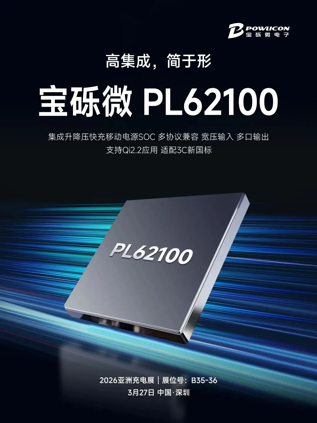 面向更高集成度应用,宝砾微电子还将展示 PL62100,这是一款 集成升降压快充的移动电源 SoC,支持 多协议兼容、宽压输入、多口输出,并支持 Qi2.2 应用、适配 3C 新国标。