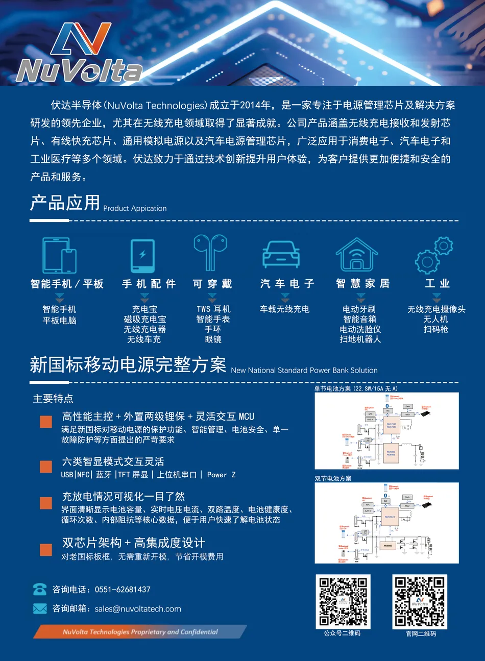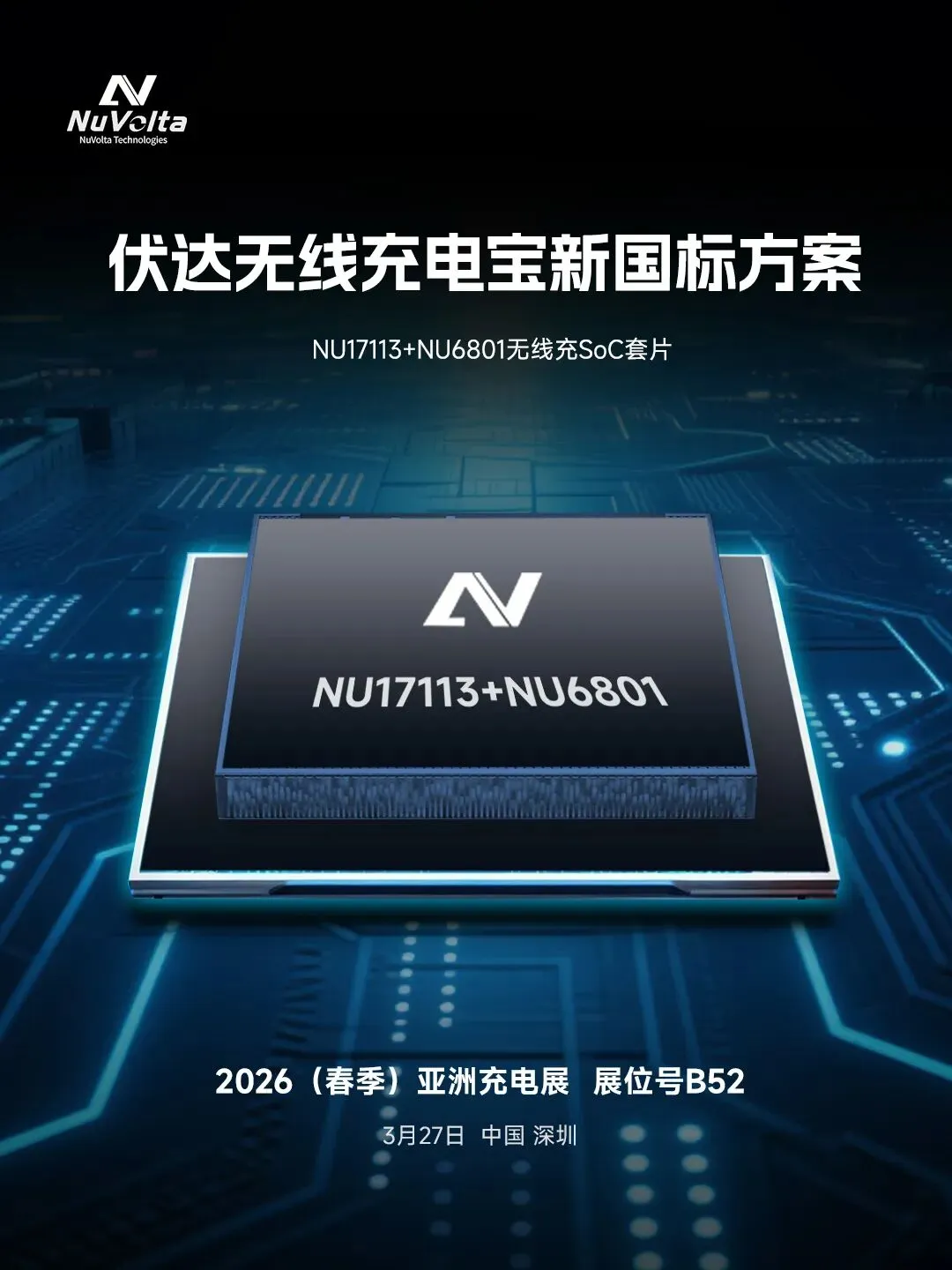 伏达这次将会带来NU17113 + NU6801 无线充 SoC 套片,主打 无线充电宝新国标方案,面向新一代无线充移动电源应用。