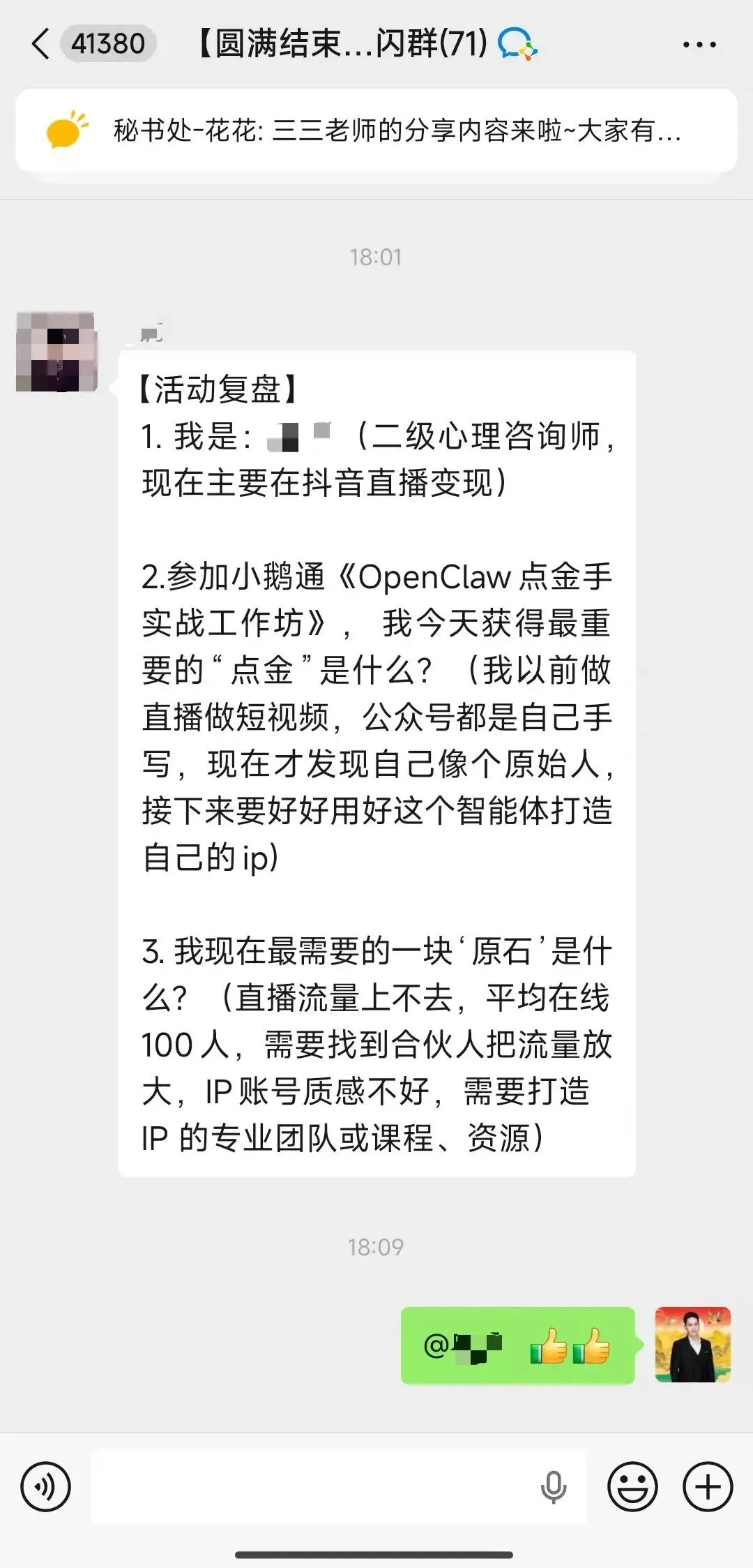 3月21号下午,我们在小鹅通总部搞了场《OpenClaw点金手深圳实战工作坊》。原计划只开放35个名额,结果报名链接一放出去,唰唰唰报了70个人。活动开始前,花花跟我说:“光现教练,人坐不下了,得换个大场地!”