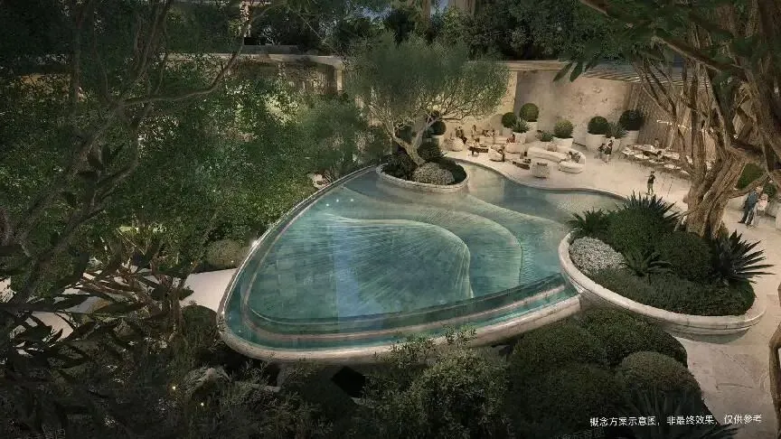 二层打造全龄活动空间,中央有约170方的儿童戏水池,用珠光贝母铺底,远望悬浮半空如珍贵的蓝宝石,因此也称之为”蔚蓝宝石“,是园林的点睛之笔,与戏水池无缝衔接的儿童乐园,是社区的活力心脏,家长可以在孩子玩水的时候,在旁边喝杯咖啡、和朋友聊天;晚上可以在这里办一场星空派对,让社交成为璀璨的日常仪式。
