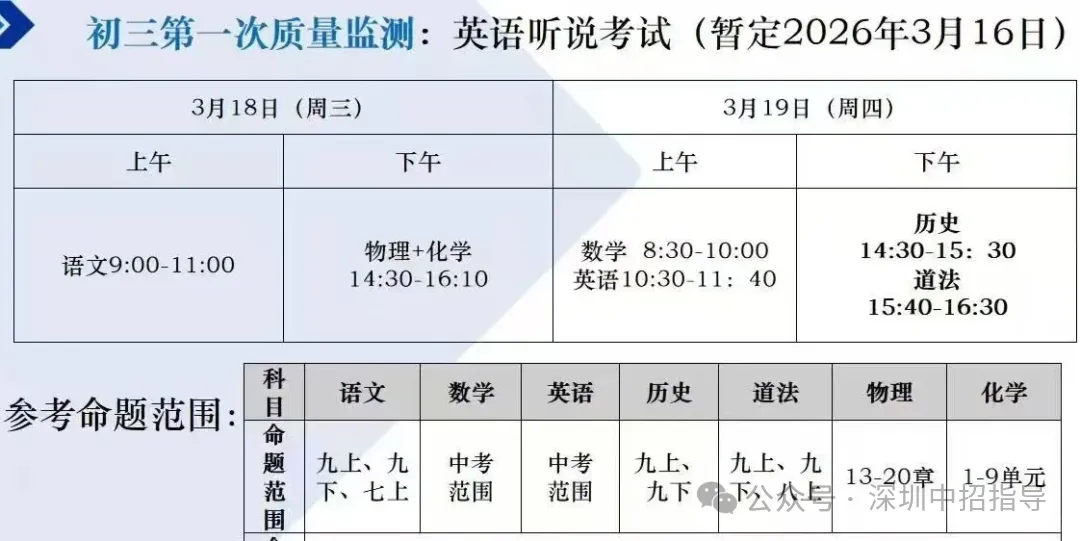 育才集团初三第一次质量监测安排在3月18日-3月19日,英语听说考试暂定3月16日。