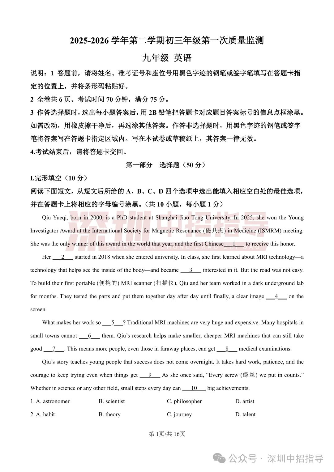 育才集团初三一模全科真题+解析