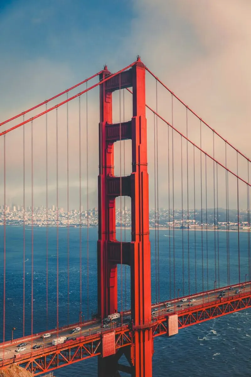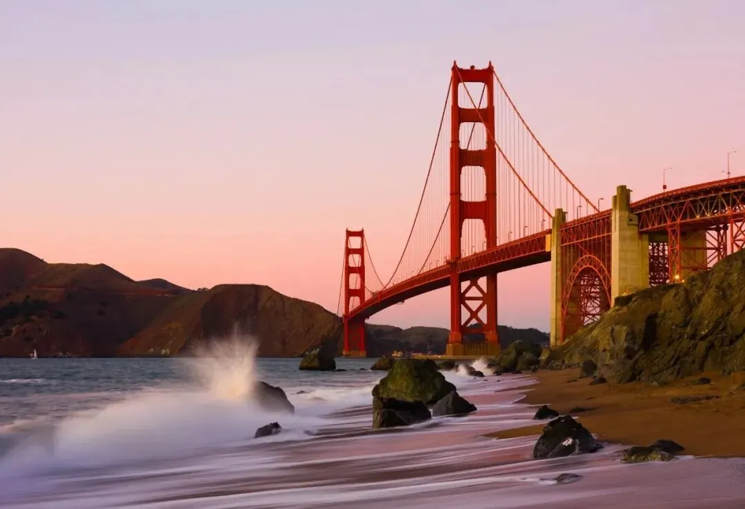 下楼继续往前走。真的,每一处都想拍照,每一段的风景都不一样。记得要回头看——巨大的桥身就在你身后转身、摆尾,那种感觉特别奇妙。正好赶上日落,金色的余晖映在红色护栏和桥墩上,说不出的美好、温暖。