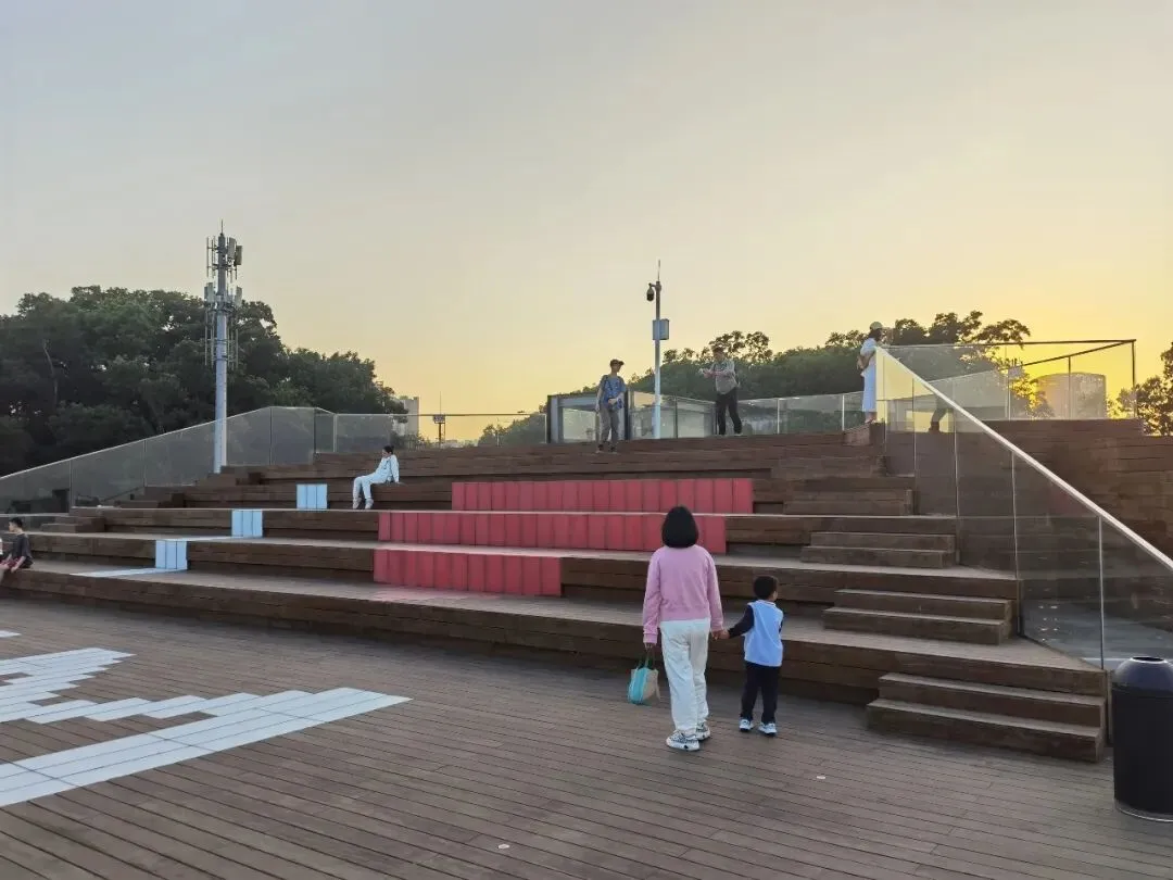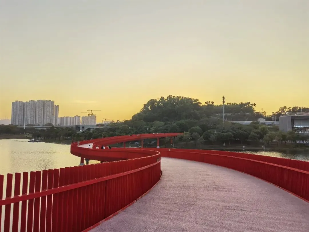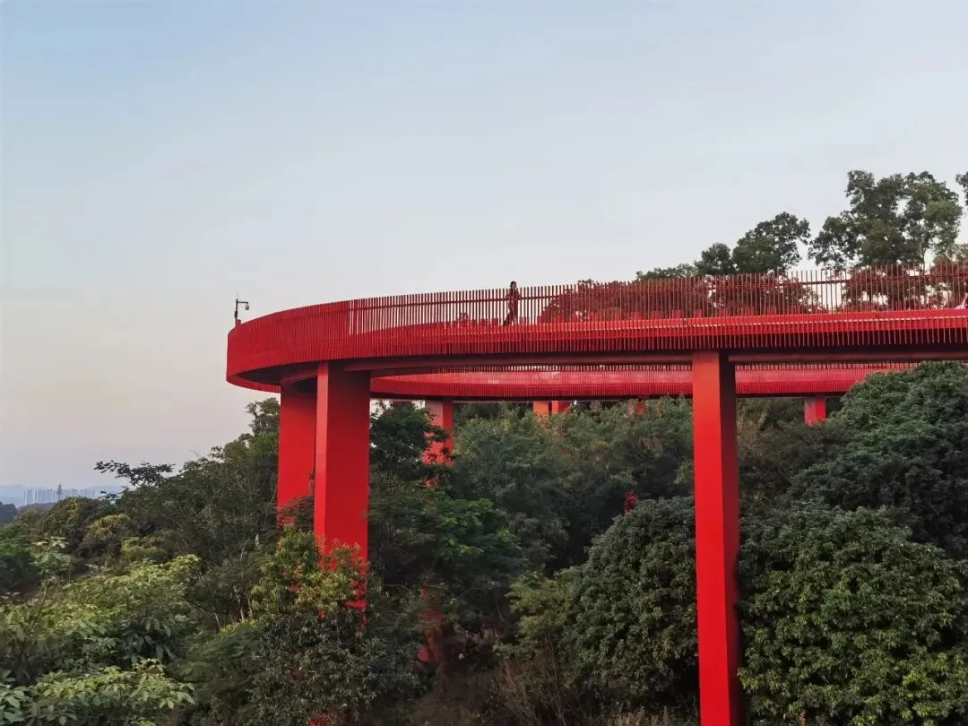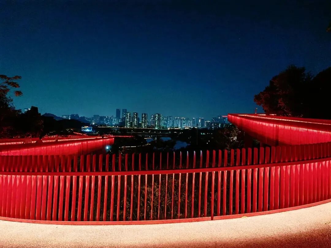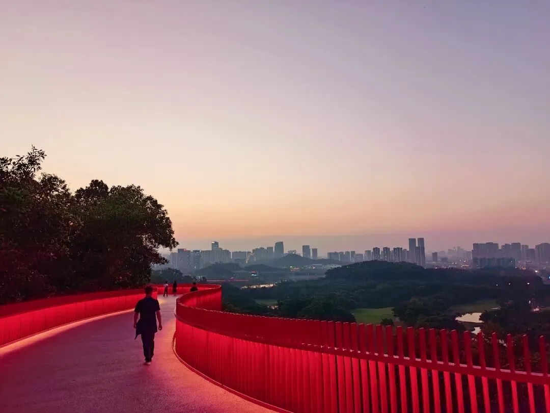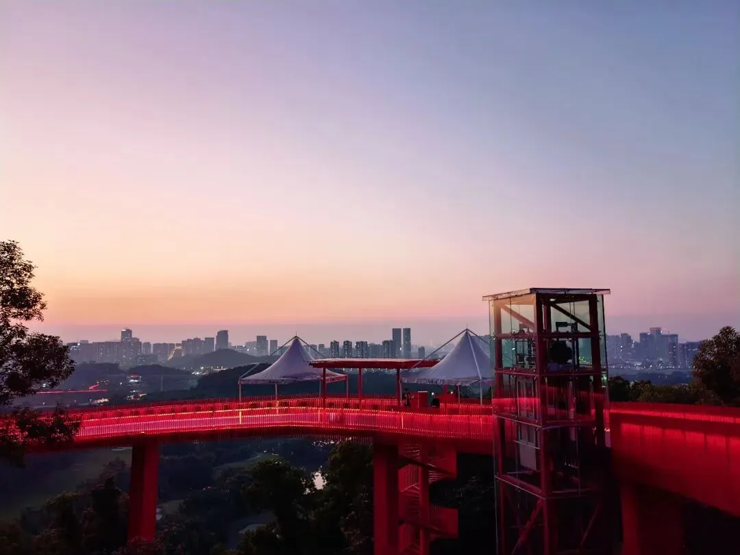 廊道的尽头是一座高高的观景台,大概四五层楼高,踩着穿孔钢板往上走,说实话我有点腿软。但到了顶上就不一样了——整个光明区都在眼底,落日把一切都染成了金色,虹桥在泛光照明下,像一条伸向远方的红色大道。那种静谧,那种黄昏,那种落日和森林交织,陌生而又亲切的感觉,在CBD里永远找不到。