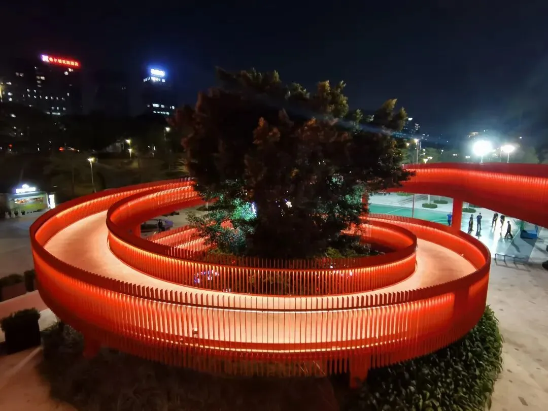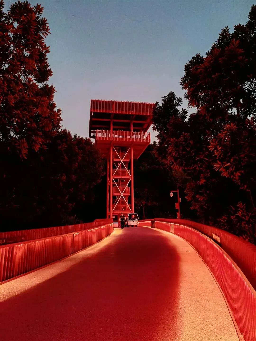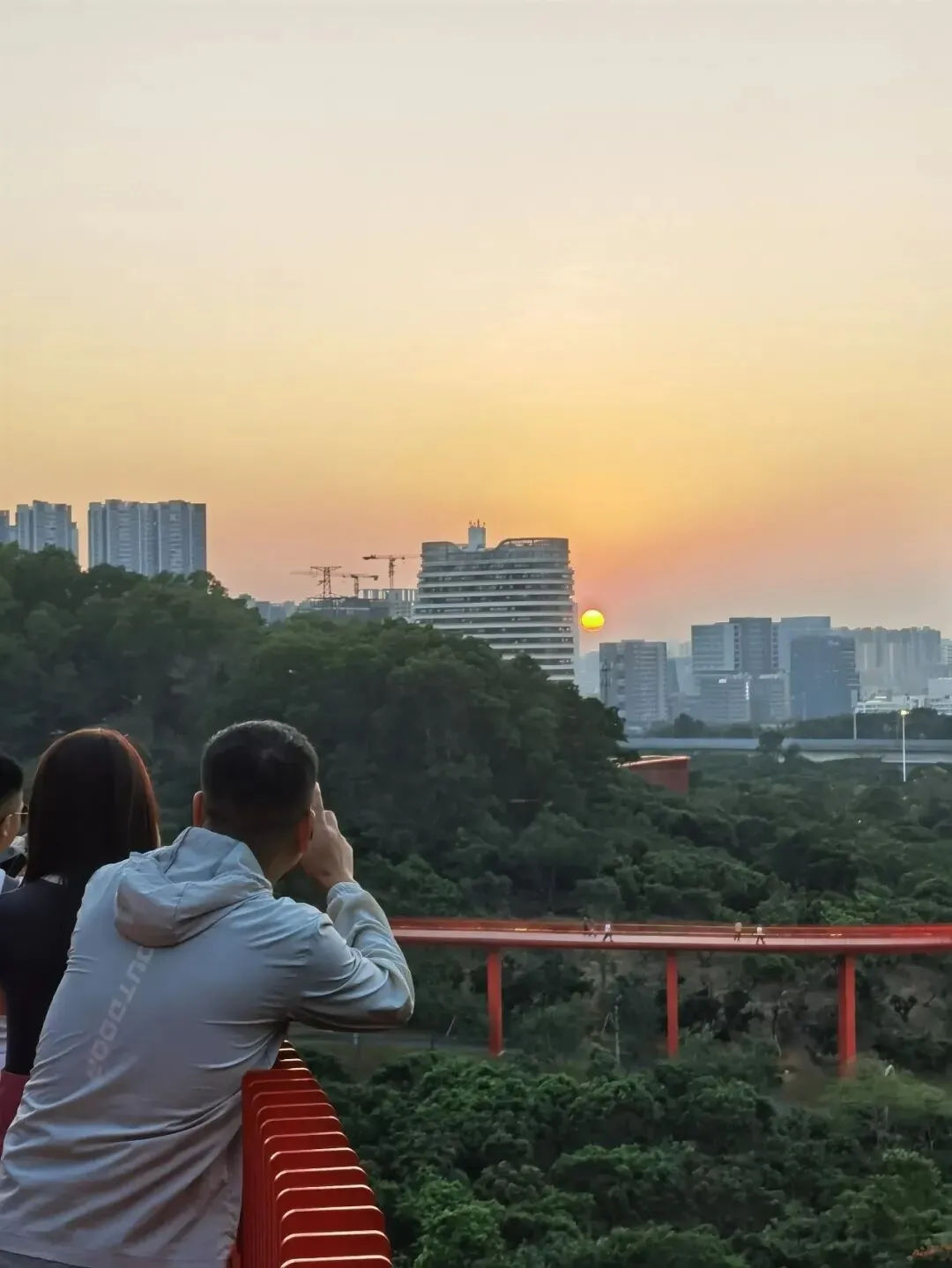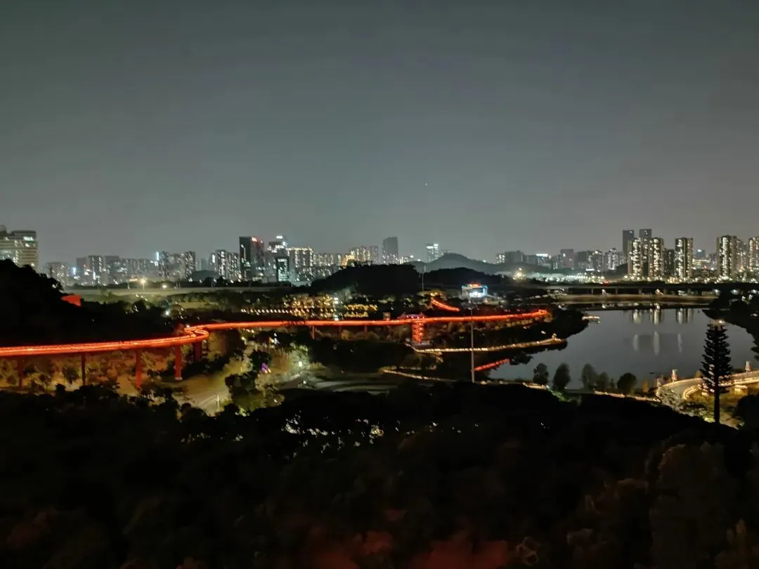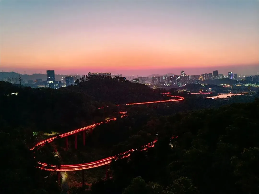 廊道的尽头是一座高高的观景台,大概四五层楼高,踩着穿孔钢板往上走,说实话我有点腿软。但到了顶上就不一样了——整个光明区都在眼底,落日把一切都染成了金色,虹桥在泛光照明下,像一条伸向远方的红色大道。那种静谧,那种黄昏,那种落日和森林交织,陌生而又亲切的感觉,在CBD里永远找不到。