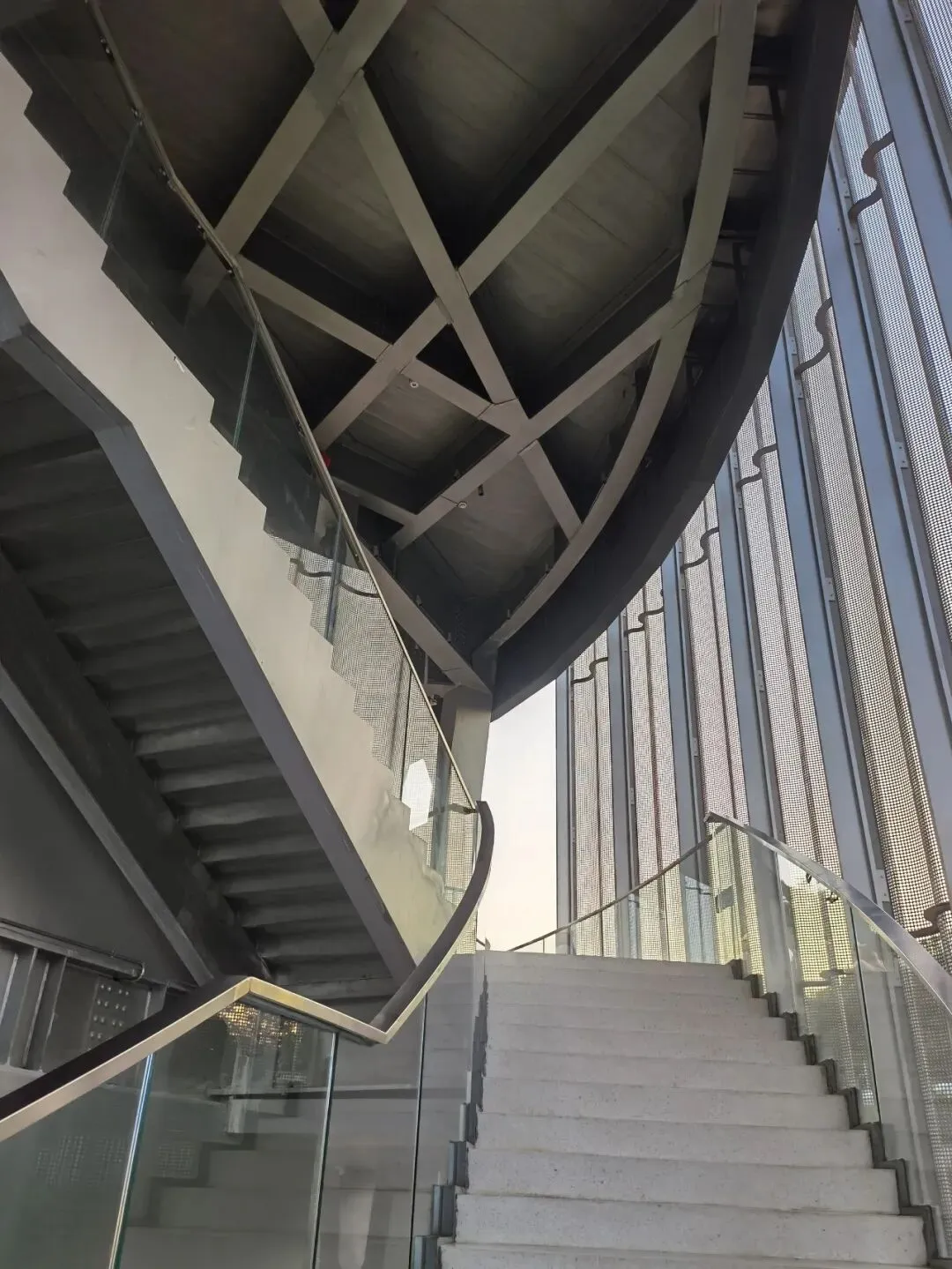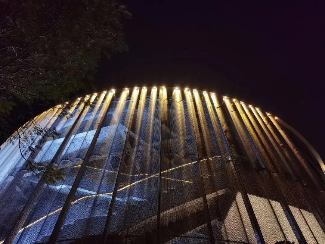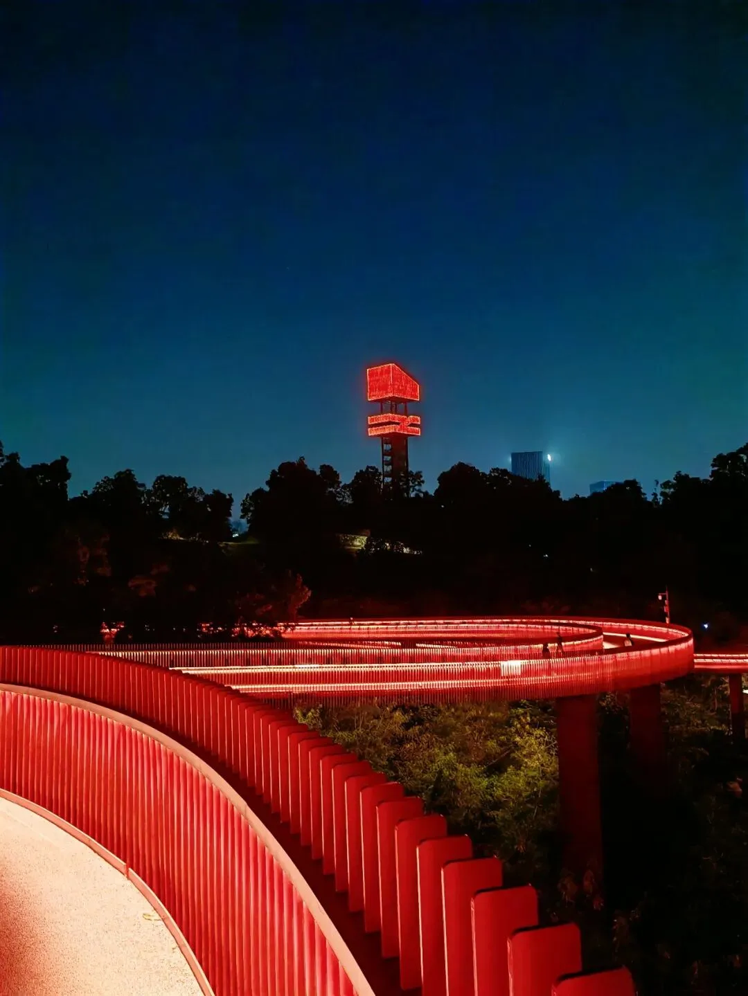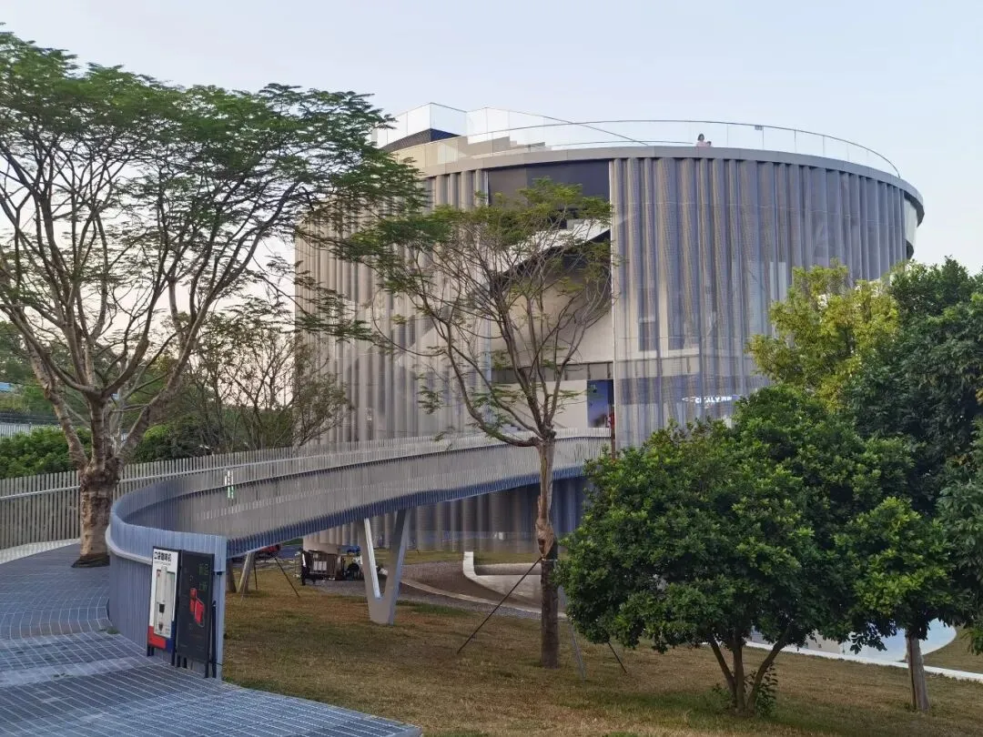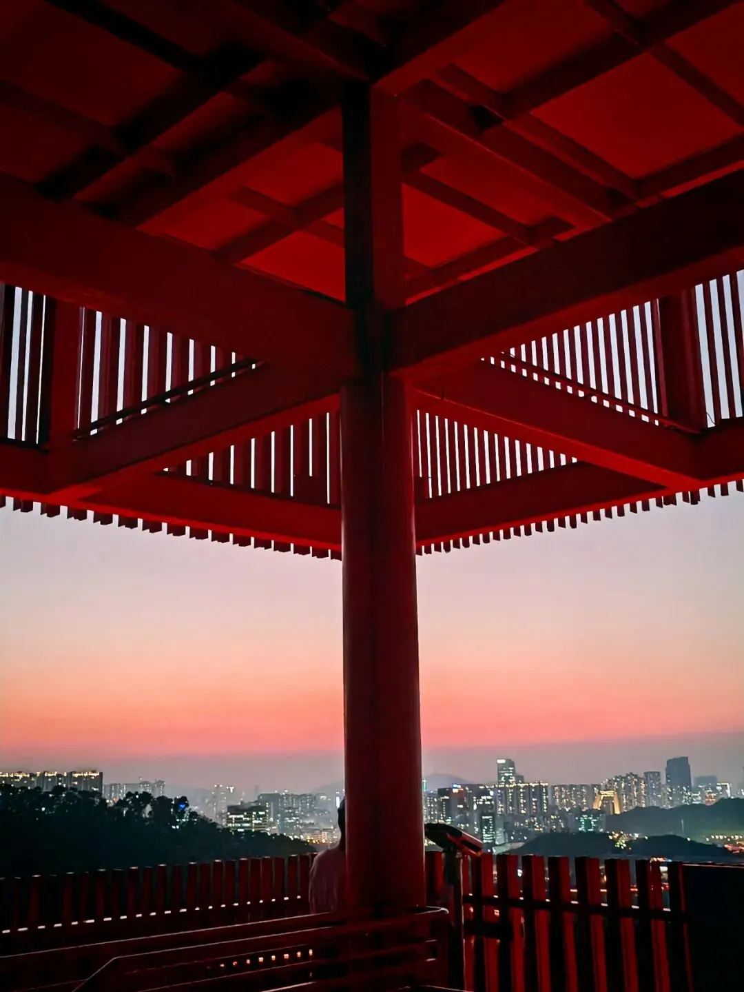 廊道的尽头是一座高高的观景台,大概四五层楼高,踩着穿孔钢板往上走,说实话我有点腿软。但到了顶上就不一样了——整个光明区都在眼底,落日把一切都染成了金色,虹桥在泛光照明下,像一条伸向远方的红色大道。那种静谧,那种黄昏,那种落日和森林交织,陌生而又亲切的感觉,在CBD里永远找不到。