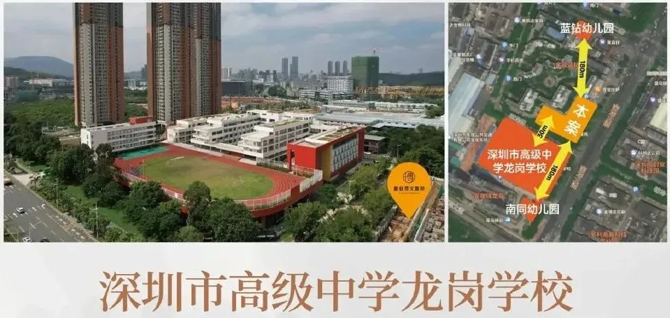 对街即是深圳市高级中学龙岗学校(九年一贯制学校),南同幼儿园、蓝钻幼儿园步行约180米即可到达,12年全龄教育就在家门口,近距离呵护孩子成长。