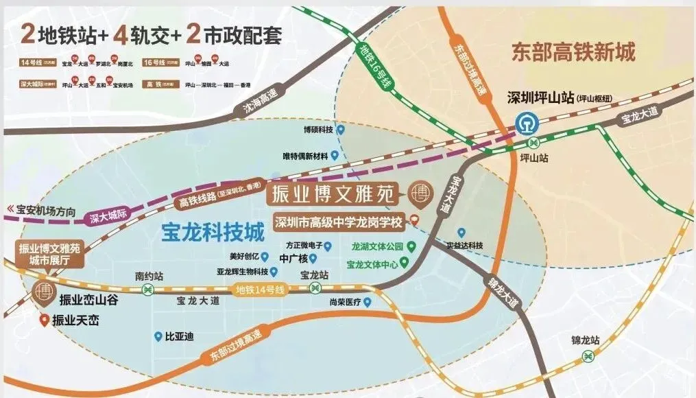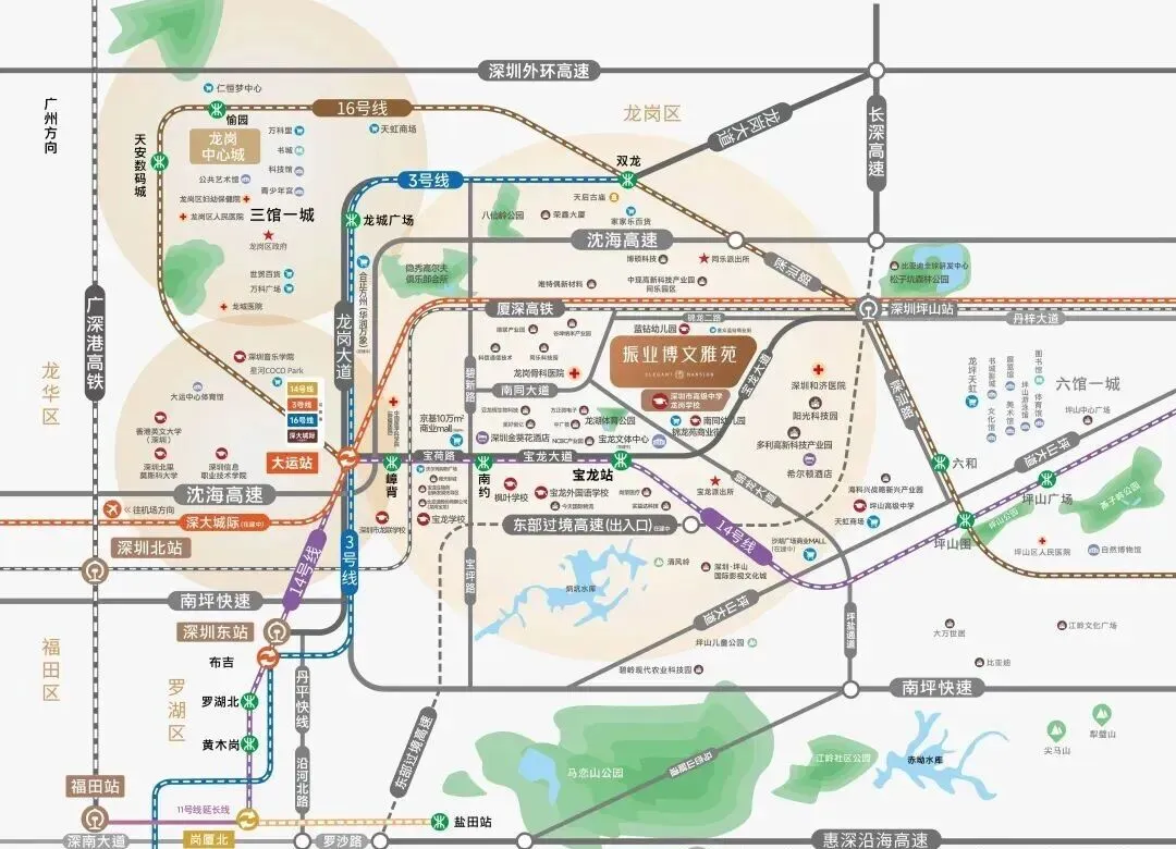 16号线坪山站 :坪山站升级“坪山综合交通枢纽”,16号线、高铁、深大城际(宝安机场——坪山,在建)三轨交汇;