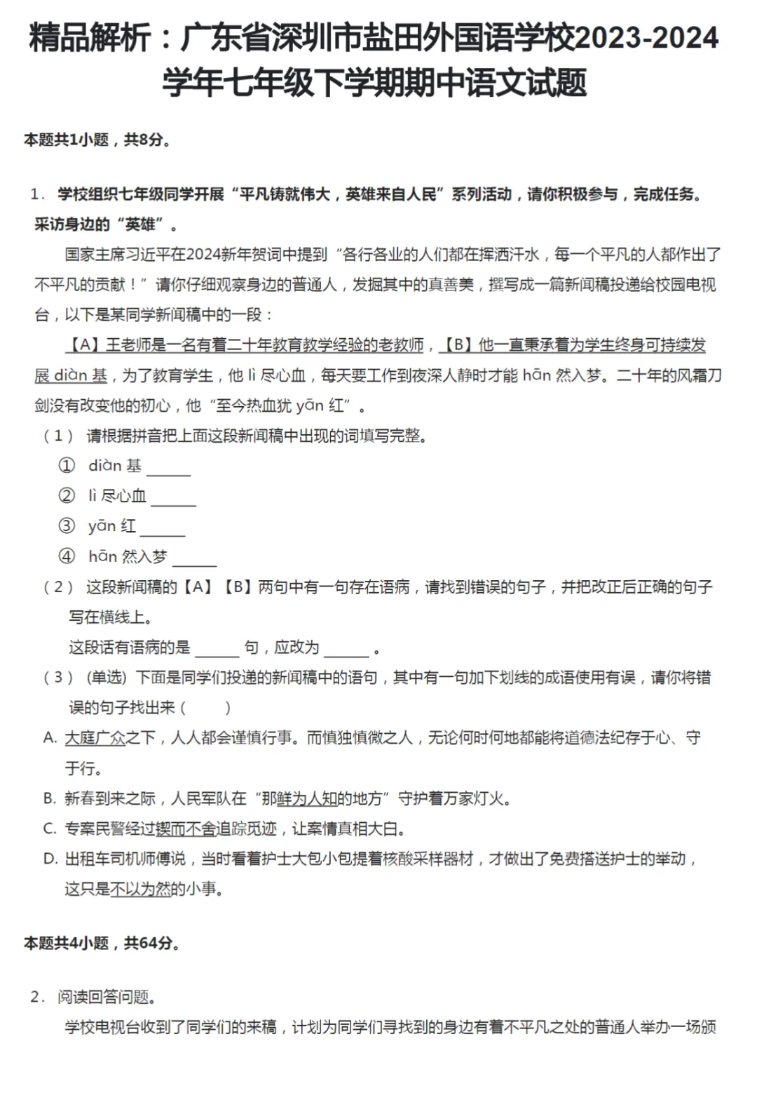 110套2016-2025年广东深圳初一下学期期中语文试卷及答案解析