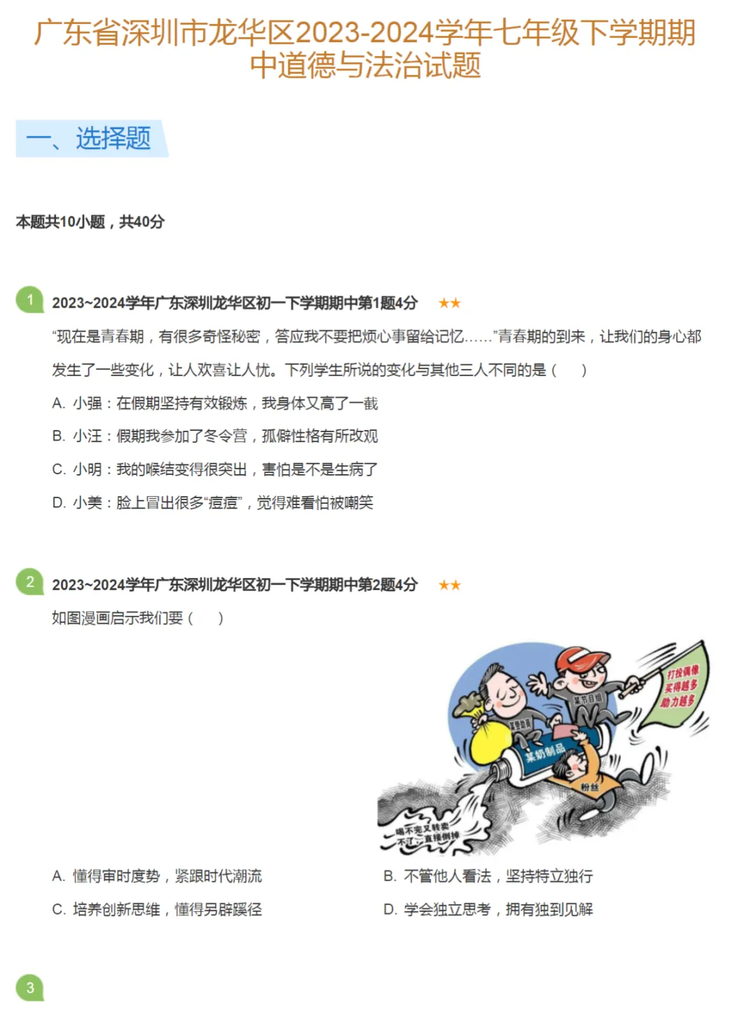 31套2018-2025年广东深圳初一下学期期中政治试卷及答案解析