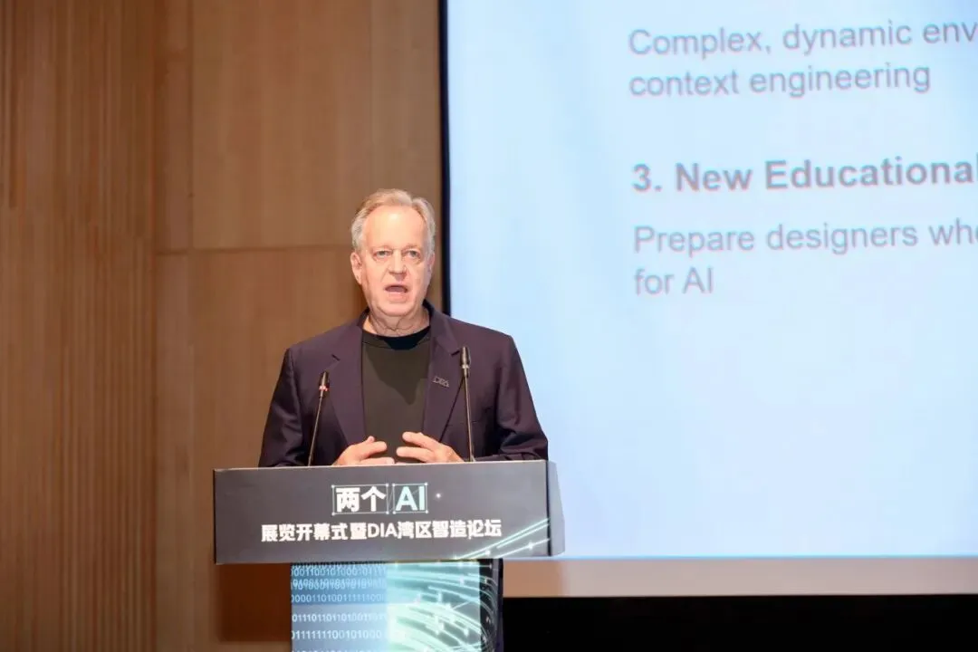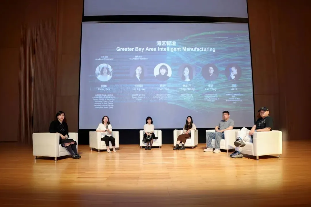 作为“两个AI”展览的衍生活动之一,DIA湾区智造论坛同期展开,南方科技大学创新创意设计学院院长关道文(Thomas Kvan)与华为消费者BG工业设计部智慧出行首席设计师伍国平,分别就《设计、情景与智能》与《无界互联 智慧新篇》发表主旨演讲。随后,就“湾区智造”的实践案例,五位知名学者、设计师及企业精英展开圆桌论坛,圆桌由中国美术学院文创中心副主任熊娜担任圆桌主持,对话嘉宾有迈瑞医疗设计总监何丽娟、腾讯设计杰出专家陈妍、强脑科技副总裁杨钊祎、万拓科技设计总监崔杨及毕鲁斯人工智能创始人吕嘉,共探AI在湾区产业的融合路径。