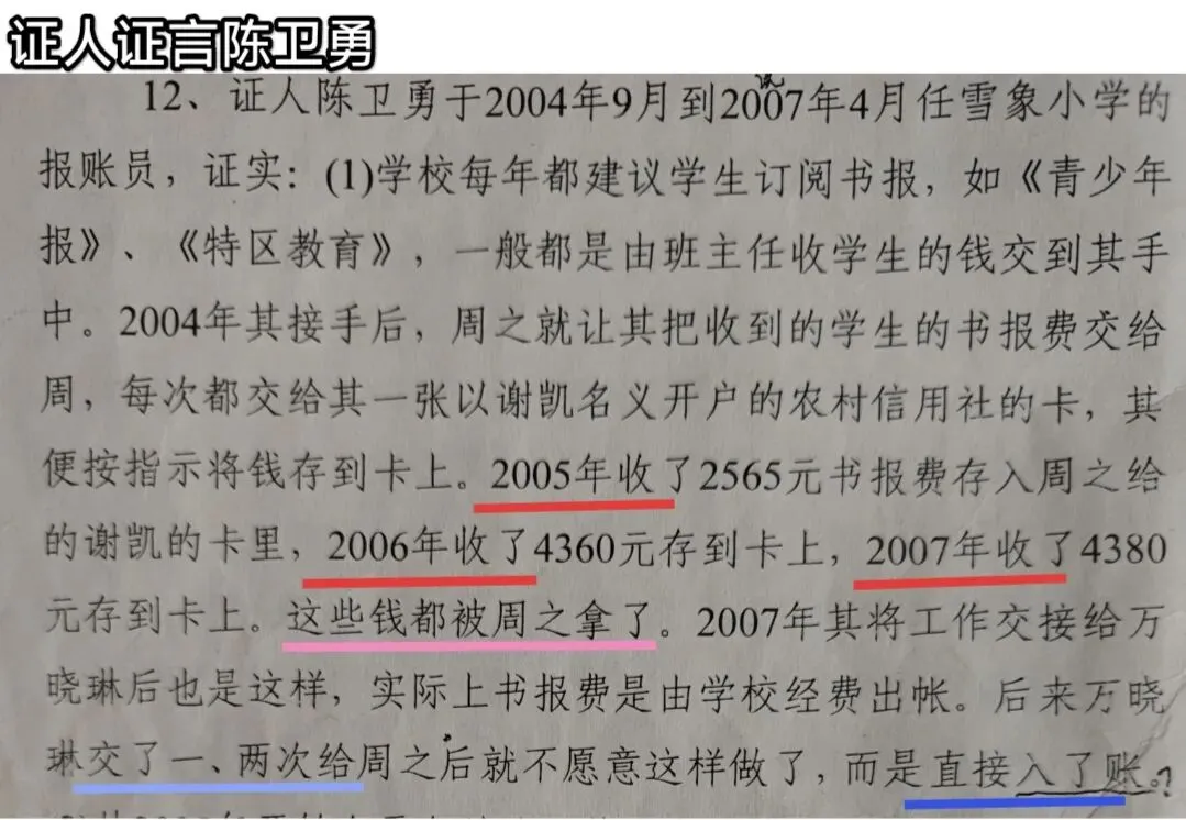 ①孤证问题:其关于“2007年所收5500元书报费直接给校长现金”的陈述,仅有单方证言,无收款凭证、银行记录或其他证人佐证,属于“言辞孤证”。
