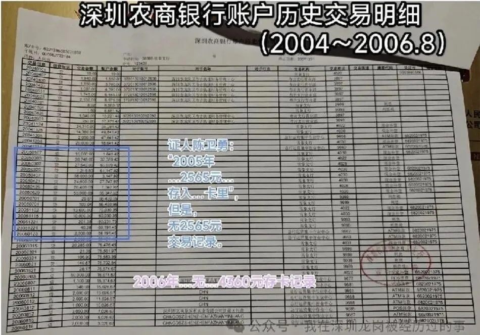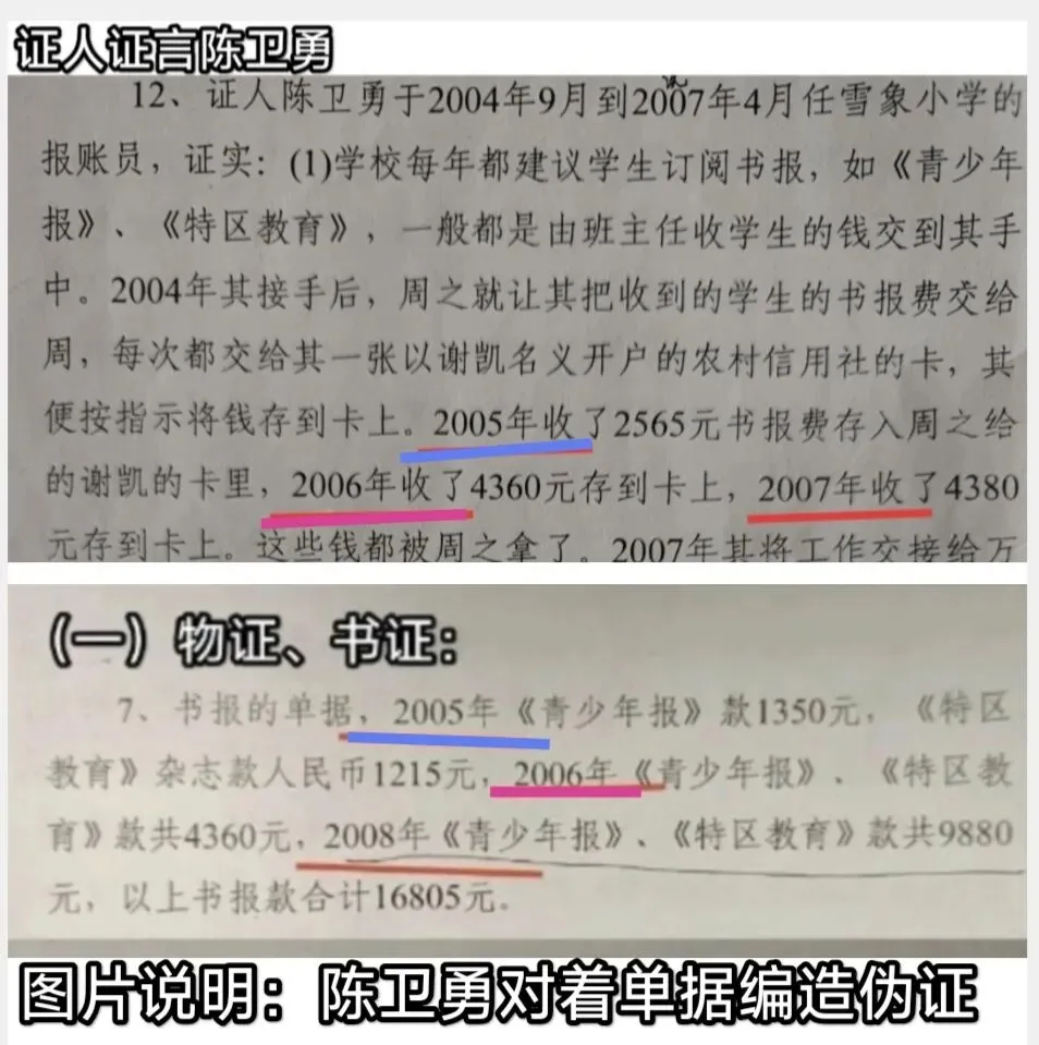 陈卫勇证言2005年收了2565元存卡,但2005年单据2565元、其实是2004学年(2004下~2005上)用的;2006年票据4360元,其实是2005学年用的——(2005年9月~2006年7月),常规:用完了才结账。证明陈卫勇存卡4360元(单据金额)是伪证。