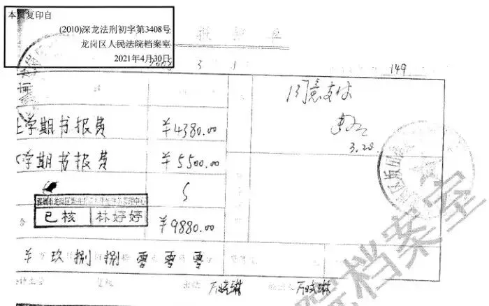 即“物证书证”的单据载明的金额“2565,4360,9880”,三个学年,学生稳定,金额异常。