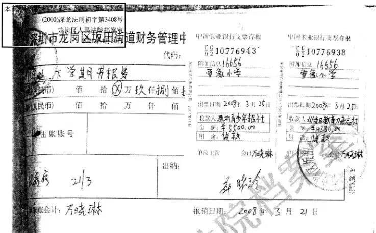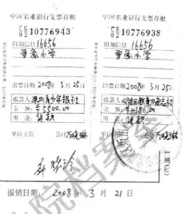 ③银行支票存根二张:6934号金额5500元收款人是“深圳青少年报社”,6938号金额4380元收款人是“《特区教育》杂志社”。