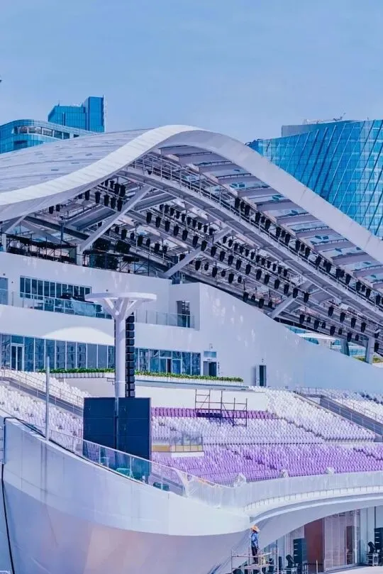 深圳欢乐港湾的欢乐剧场,2025年9月26日刚亮相。它是全国最大的户外水上舞台,水域总面积8000平方米,主舞台1600平方米,可容纳8000名观众。