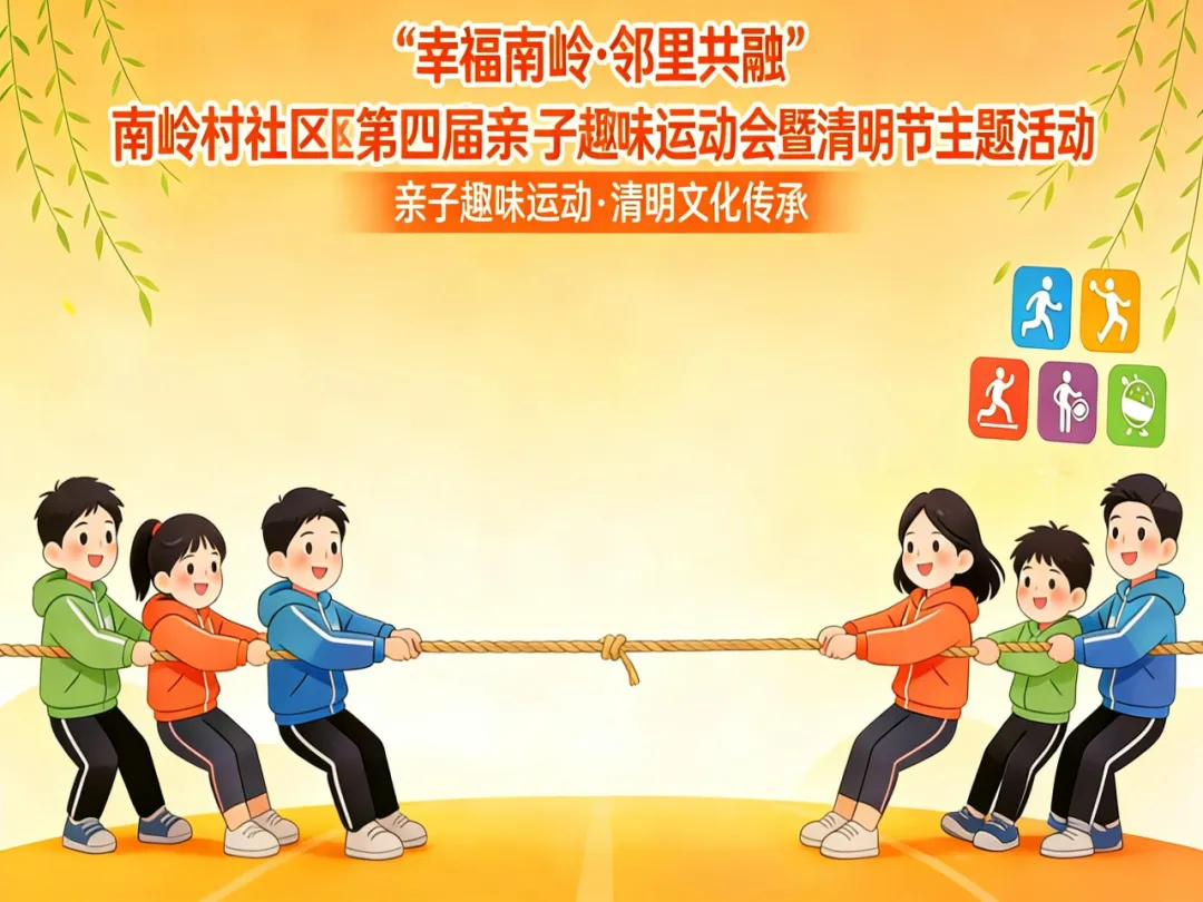 南岭村社区党群服务中心将开展亲子趣味运动会暨清明节主题活动,设置拔河比赛、两人三足、背靠背运球等亲子互动项目,让家长与孩子在协作竞技中感受运动的快乐、增进亲子感情。活动还将融入清明节传统习俗讲解,让大家在欢乐氛围中了解传统节日文化,进一步增强社区凝聚力与居民归属感。