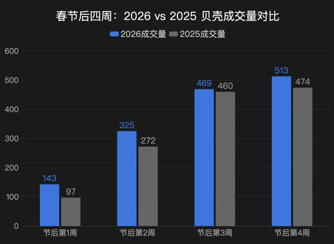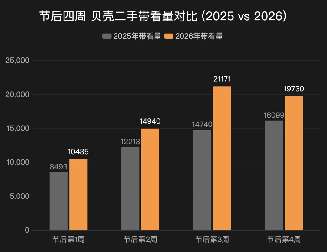 2026年的看房人数,节后四周全部正增长,而且增幅比成交量大得多