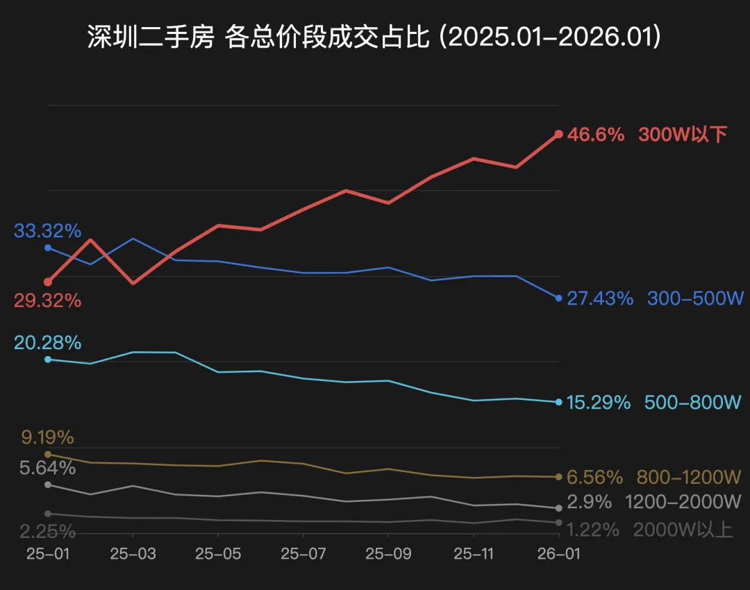 300万以下的房源成交占比,从2025年初的29%,一路上升至2026年1月的46%。