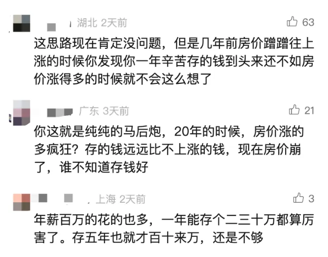 看到这个故事,不少网友感慨,2020 年的时候房价涨得有多疯狂,存钱的速度永远赶不上房价上涨的速度,换谁都会想着买房保值;现在房价跌了,才说别买太贵的房,不过是马后炮。