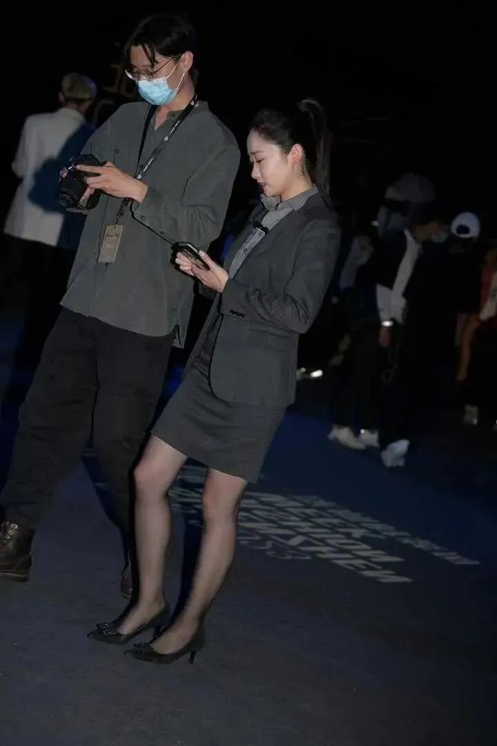 她和比她小的年轻男性交流时,是低着头,低头看手机的,眼神温柔,笑靥如花。深灰色西装套裙与男性的休闲风格存在较大反差,从而突出了她的干练、精致气质。即使在轻松愉悦的交谈中她的职场气度也不会受到影响。这种反差,让她看起来更专业,更有魅力。