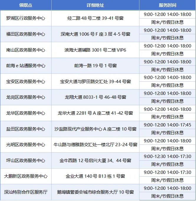 收到退件短信后,前往注册地所在区政务服务中心领取。各区领取点详细地址及服务时间详见下表: