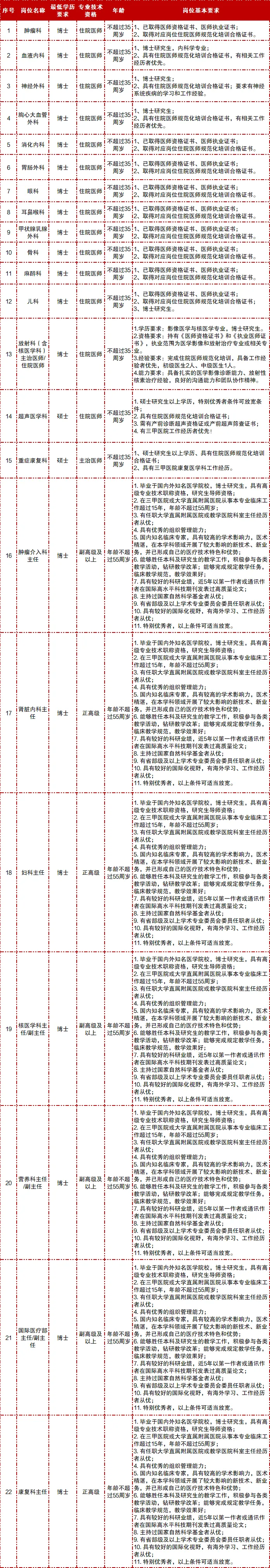 基本要求:具有良好的专业背景和发展潜力,具有临床医师执业、资格证书和住院医师规范化培训合格证书。特别优秀者,可竞聘科室助理主任。(特别优秀者,以上条件可适当放宽)