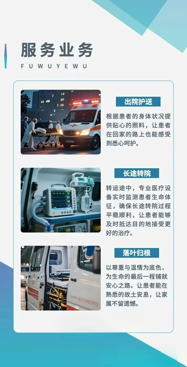 我们是120救护车出租转运服务公司,我们家的业务有出租转运、120急救转运、跨省转院、出院转院等等,我们都可以做。只要是转院病人,就可以找我们。我们家可以直接电话预约,特别方便。您只需要给我们打个电话,我们最快15分钟就可以出车。接上了病人就直奔目的地走。我们家收费标准也是明明白白的,绝对不绕弯路,不坑人,家属们。放心吧。