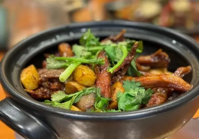 土豆鸭舌煲。这个组合让人疑惑,但香味一出来就明白了。鸭舌软糯入味,和土豆黏在一起像用时间熬出来的老友关系。那种“入口即化”说得俗气,但真的是,吃到嘴里不用嚼,咸香就化在舌头上。我发现自己夹了第三块才停住。