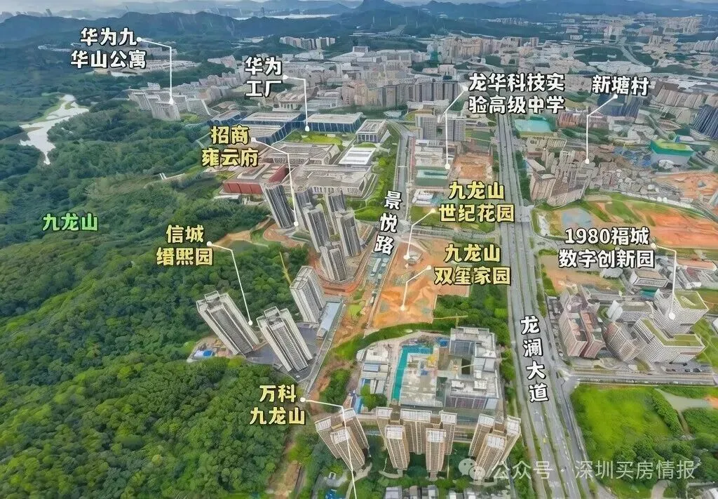 招商雍云府,位于深圳市龙华区福城街道九龙山社区龙澜大道旁,地处九龙山智能科技城核心区,规划范围9.81平方公里,是深圳市重点区域之一。项目紧邻华为新基地(直线距离约50米)和美团大湾区总部(约200米),处于龙华区福城街道与观澜街道交界处,西侧紧邻大水坑社区公园,北侧为九龙山风景区,生态资源丰富。