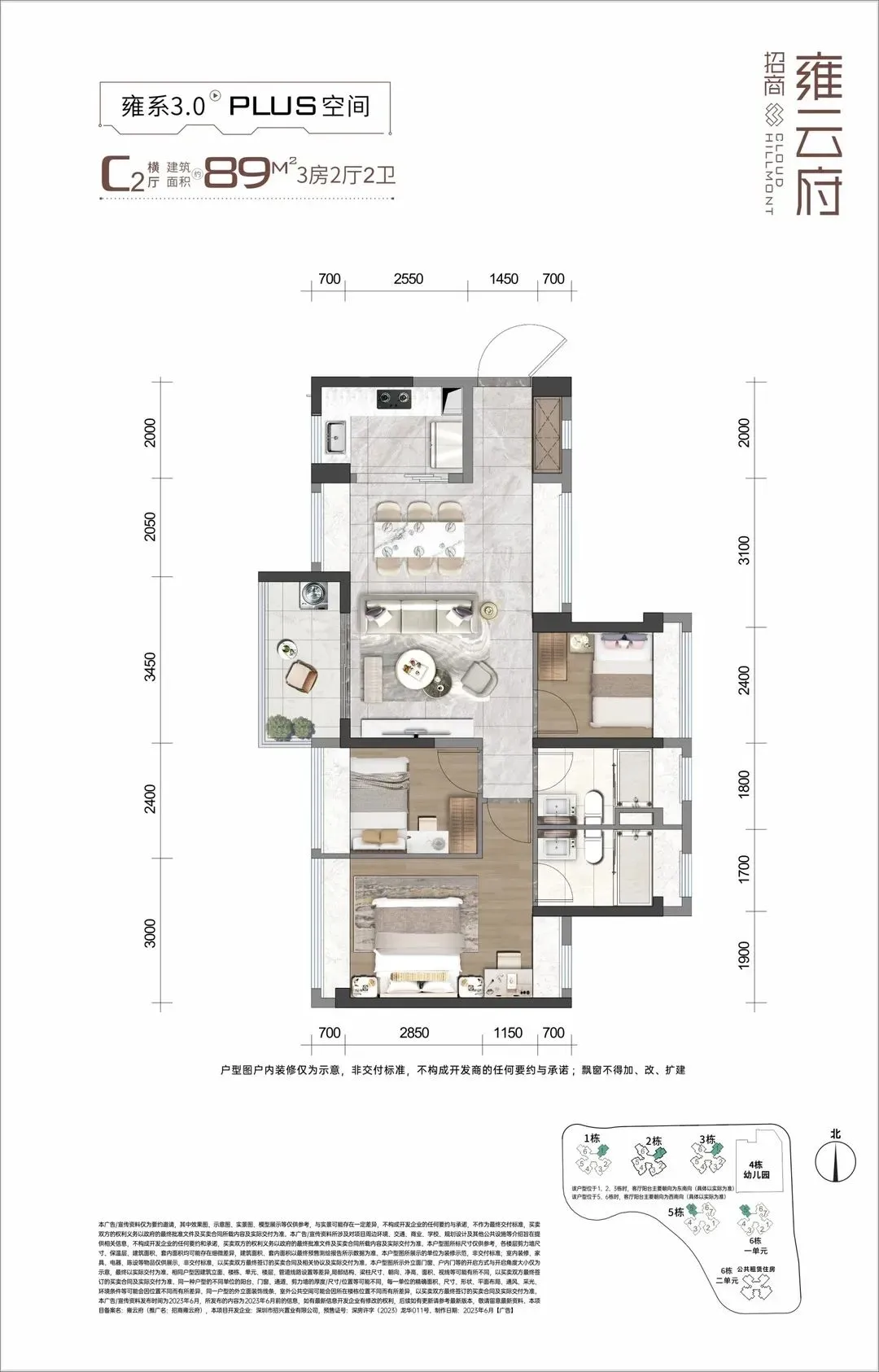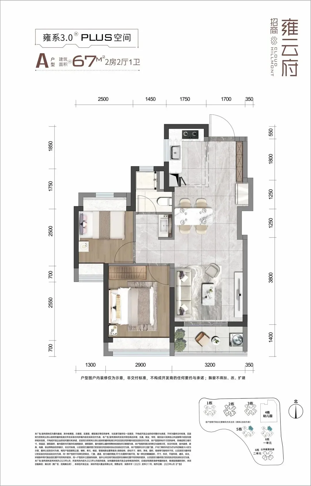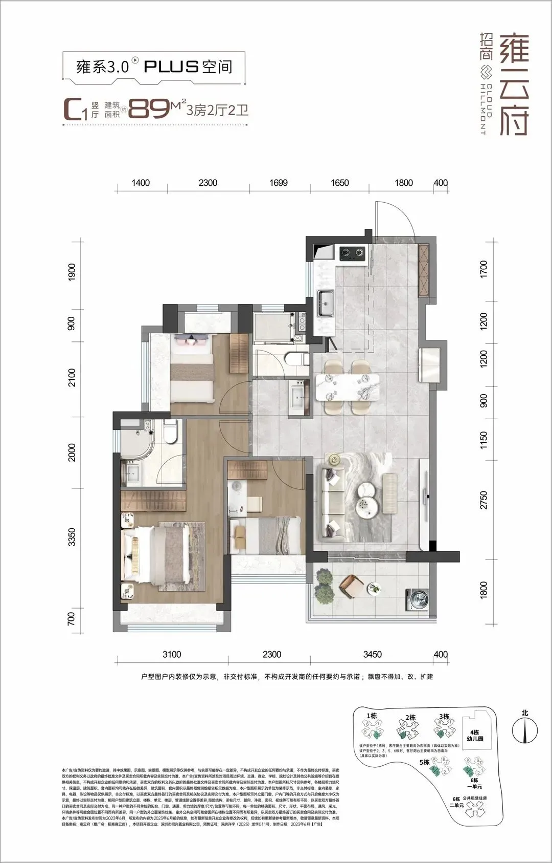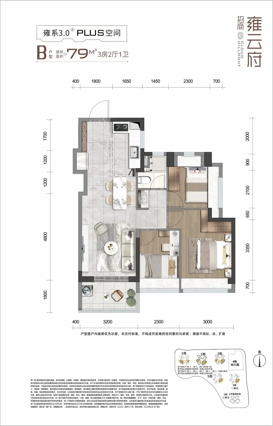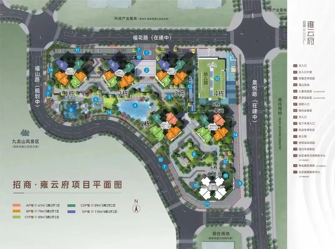 招商雍云府,占地面积约2.7万㎡,总建筑面积约13.36万㎡,计容建筑面积9.76万㎡,容积率3.5,共由6栋22-31F住宅组成,其中1栋商品房31F,2/3/5栋商品房30F,6栋1单元商品房29F,6栋2单元公共租赁住房22F,4栋是1所9班制幼儿园。