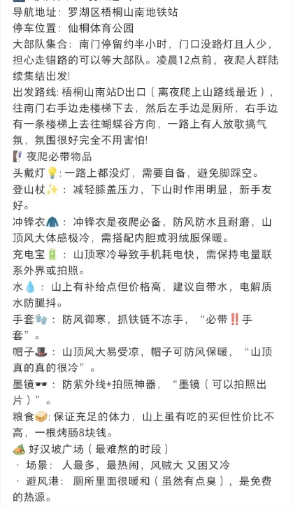 :我们是半夜12点开始爬,3点半就到小梧桐了,然后大部分人会在3点半到5点半之间在电视塔休息,5点半开始上好汉坡,然后等日出。没有垫子的话,坐地上还是会冷,能带就带上。我看到有个人带了垫子,还有人带了帐篷,在那里睡觉,当时觉得好羡慕,哈哈。