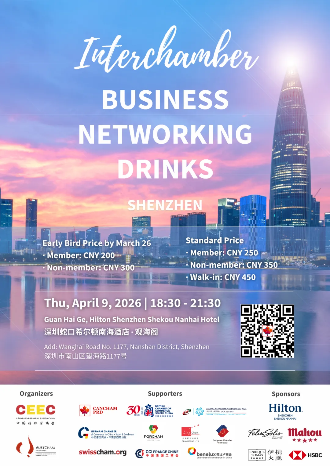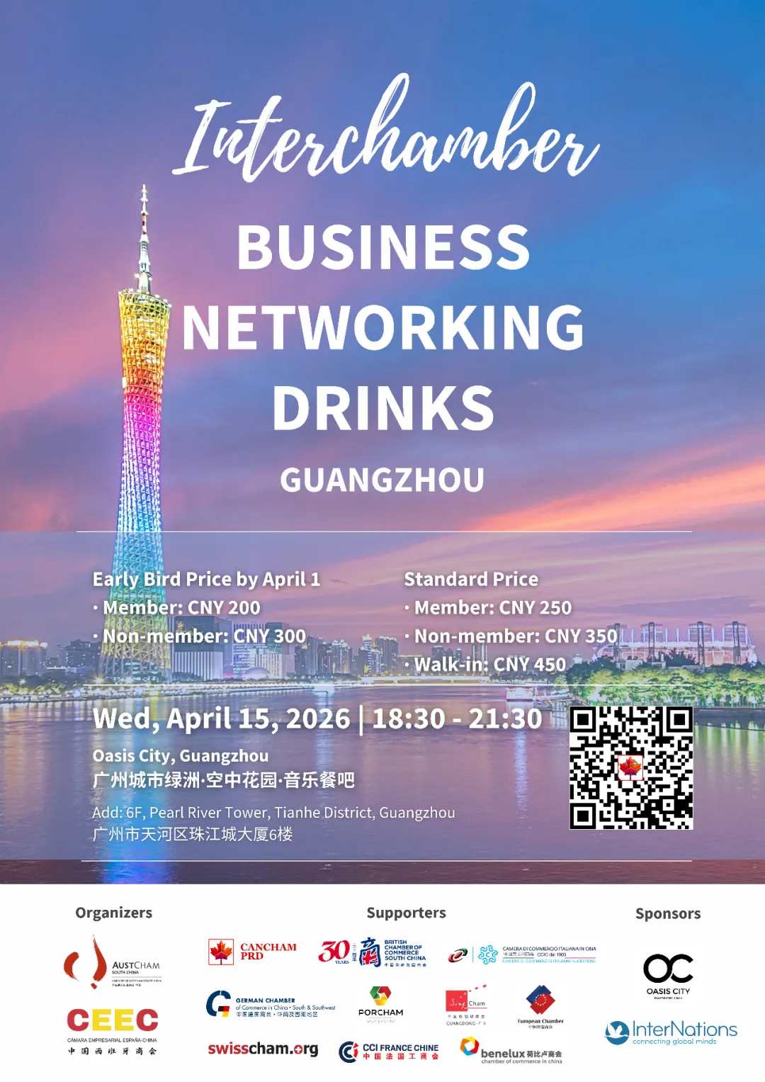 The Canadian Chamber of Commerce in South China (CanCham PRD), alongside 11 other international Chambers, will be co-organizing the InterChamber Business Networking & Drinks Event in Shenzhen on April 9 and in Guangzhou on April 15.