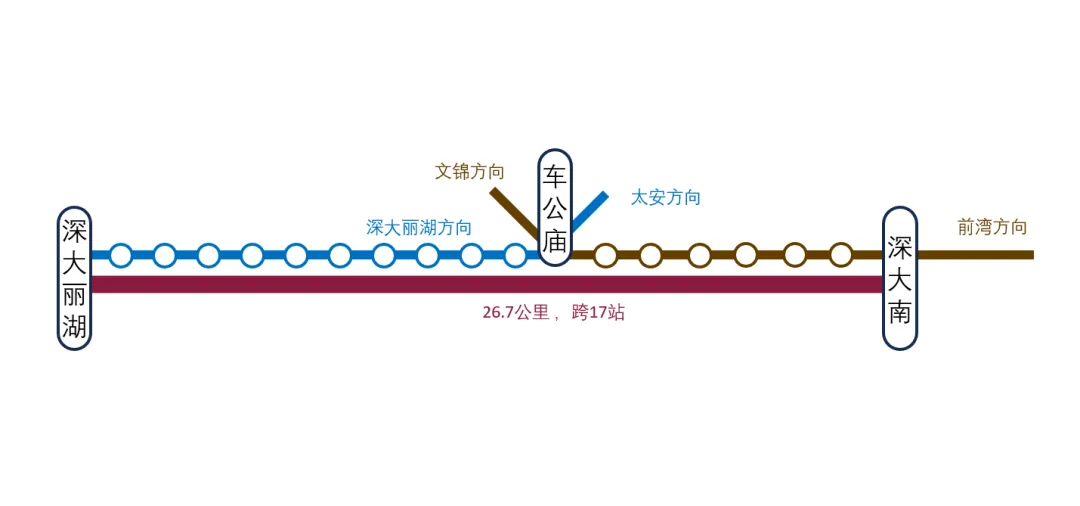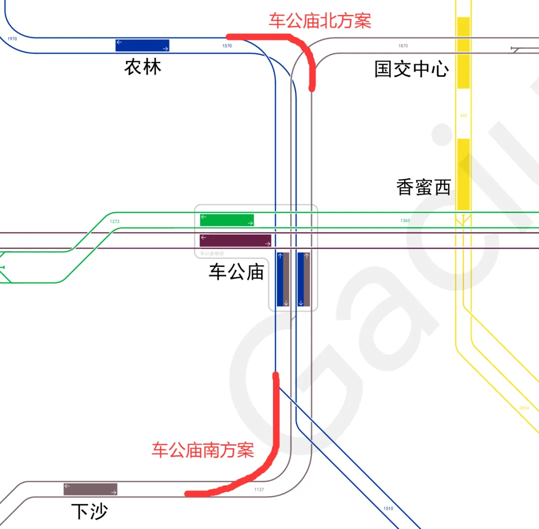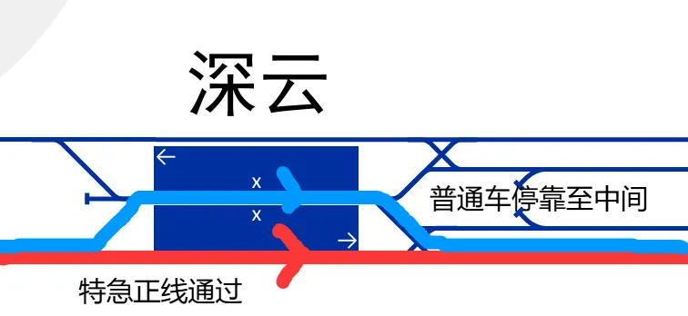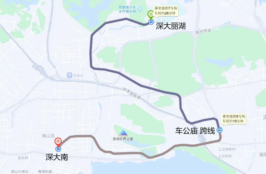 目前粤海往返丽湖可通过通勤大巴解决,通常每2-4小时一班。但对于经常往返的人来说,这种发车密度显然有点稀疏了众所周知,9号线经过深大南站,7号线经过深大丽湖站且两线在车公庙站有联络线(7号线太安方向→9号线前湾方向)深大特急列车,深大丽湖→深大南(先假设中途全部不停站)此时就可以开行深大丽湖→深大南的单向跨线交路了。该交路全长26.7公里,跨越17个站。预计时长为20分钟左右(根据运行时时速为80km/h的A型车推算),快于地铁换乘方案的43分钟左右。已经节省了超过一半的时间,故该方案仍然具有一定的潜力。当然,以上方案这解决了丽湖学生去往粤海校区,而粤海学生还是去不了丽湖校区啊!于是就有了如下想法:最直接想到的方法,当然是类比车公庙站的联络线,在9号线文锦方向→7号线深大丽湖方向增设联络线。但是,两个方向均未预留实施联络线,增设必然会导致停运(什么时候可以把那个成环方案用上了那就刚刚好)车公庙北方案:9号线香梅-车公庙区间;7号线农林-车公庙区间车公庙南方案:9号线下沙-车公庙区间;7号线上沙-车公庙区间无论何种方案,都直接导致7号线深云-上沙段,9号线深圳湾公园-香梅段停运。而我们不希望停运深铁的任何一条线路段,于是我们换了思路:由方案一,注意到深云站和深圳湾公园站均有存车线,我们不妨将其利用起来。从9号线深圳湾公园站连接,到7号线深云站,全长约4.26公里,采用单线布置,供深大南→深大丽湖方向列车行驶,施工时无需停运。上面的方案都是说的是深大南区的方案,对于北区的师生属实不友好了啊!除此之外,我们还注意到7号线与其他线路的跨线关系,理论上是可以从7号线深大丽湖站到达1号线深大站的,即通过7→2安托山联络线,2→1世界之窗联络线。不过该方案也是单向方案。粤海→丽湖方向依旧无解......就算解决了粤海学生去丽湖校区的学生,于是问题又来了,全长26.7公里,跨17个站的线路,又要涉及越行的问题了。但好在有两个站可供越行:深圳湾公园站和深云站,其中每个站安排一个普通列车停车避让,刚刚好。当然有的人会问了,深大特急专程往返于深大粤海校区和丽湖校区,应该刷深大校园卡或者什么荔园卡那些深大卡才能坐吗?亦或者是否要加收特急券?其实并不是。深大特急本质上仍是深圳地铁运营的常规线路列车,并非校内专车。它执行深圳地铁统一票价规则,和普通地铁一样,支持深圳通、乘车码、银联闪付、单程票等所有官方支付方式。