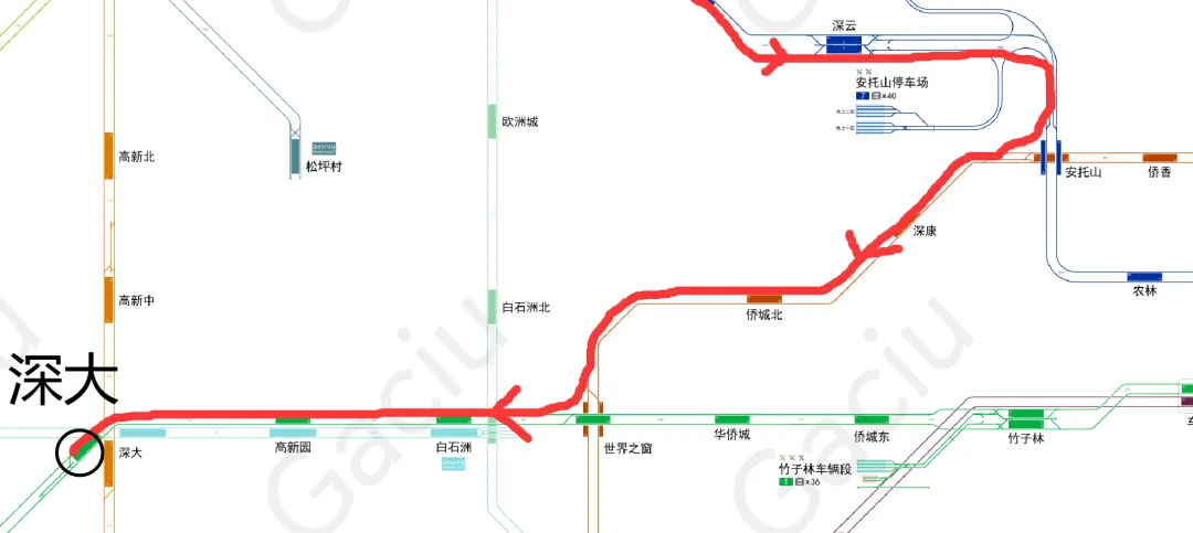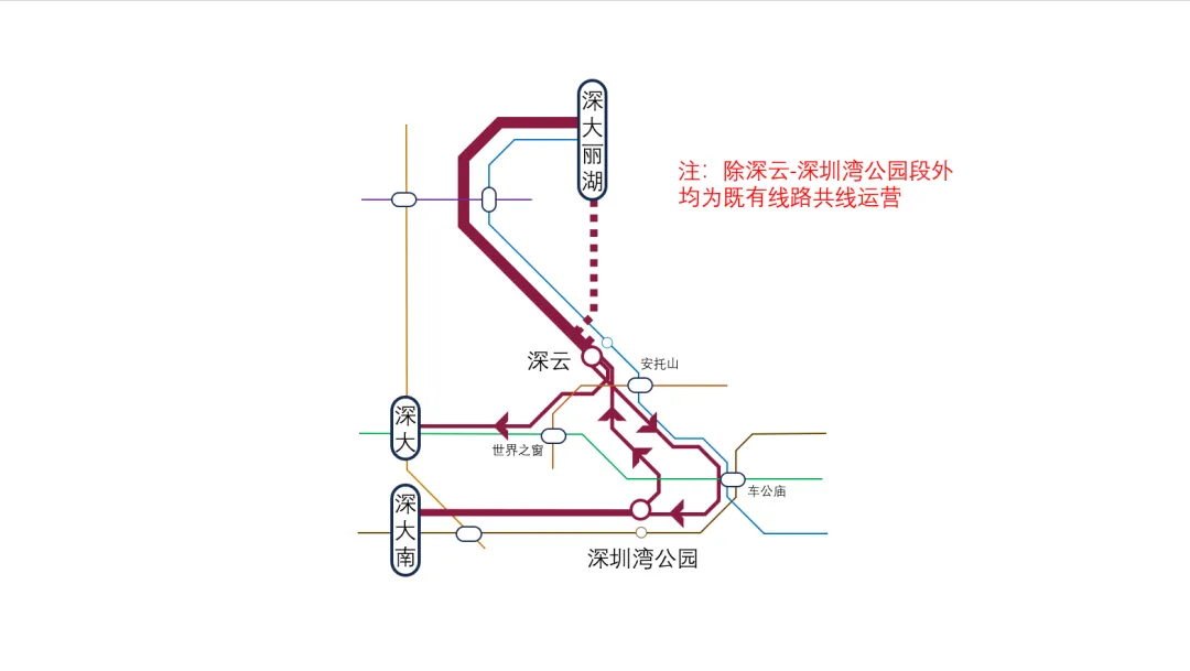 如图,为“深大铁路”和深圳地铁共存的线路图,除深云-深圳湾公园段外均为既有线路共线运营。