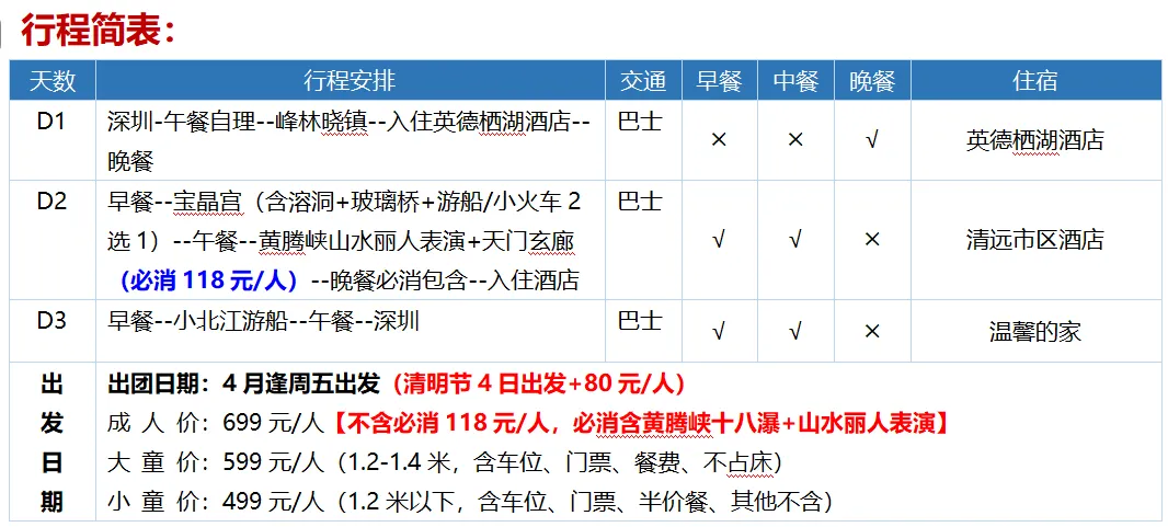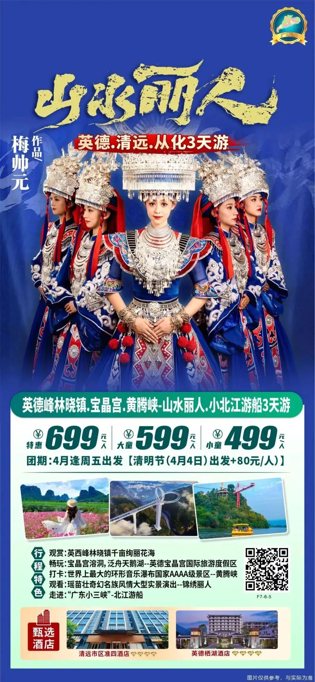观赏:英西峰林晓镇千亩绚丽花海 畅玩:宝晶宫溶洞,泛舟天鹅湖--英德宝晶宫国际旅游度假区 打卡:世界上最大的环形音乐瀑布国家AAAA级景区--黄腾峡 观看:瑶苗壮奇幻名族风情大型实景演出--锦绣丽人 走进:“广东小三峡”-北江游船 入住英栖湖酒店+清远市区4钻酒店 参考维也纳/枫度等同级 |