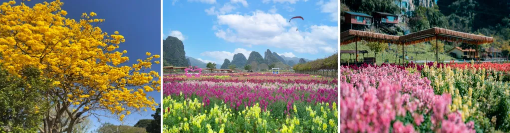 13:00前往【九龙峰林小镇】(游览约2 小时)[开放时间08:30-18:00]。九龙小镇占地7000多亩,地处于九龙镇英西峰林核心段,内有千多座呈线型排列的石灰岩质山峰,山势雄伟,景色奇特,大小溪涧、河流穿绕其间,千姿百态的山峰、神秘莫测的岩洞、嶙峋怪异的岩石、千亩花海烂漫盛开,置身其间,风光绮丽、景致醉人,大有蓝天、青山、碧水回归大自然的神韵。